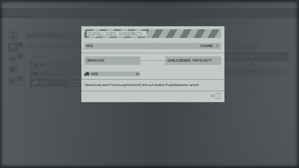 Denn mit ein wenig Glück entsteht beim Hinzufügen einer benötigten Ressource zufälliger Überschuss in Form von weiteren notwendigen Gegenständen. Fügt ihr etwa für die Nahrungsmittel-Forschung die benötigten Karotten hinzu, kann es sein, dass ihr für euren Fortschritt beim Forschungsprojekt Kartoffeln geschenkt bekommt.