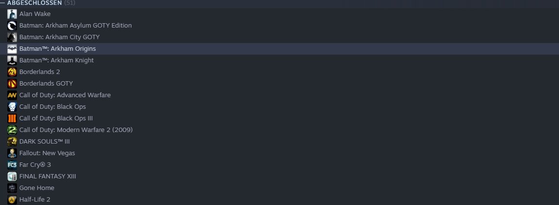 In diese Kategorie könnt ihr alle Spiele stecken, die ihr durchgespielt habt und so schnell nicht noch einmal hervorkramen wollt. Bei uns finden sich hier hauptsächlich storylastige Singleplayerspiele wie Life is Strange und die Batman-Spiele. Aber auch jährlich erscheinende Titel, wie etwa die Football-Manager-Reihe von Sports Interactive, kann man hier parken, sobald der neueste Serienteil erschienen ist.