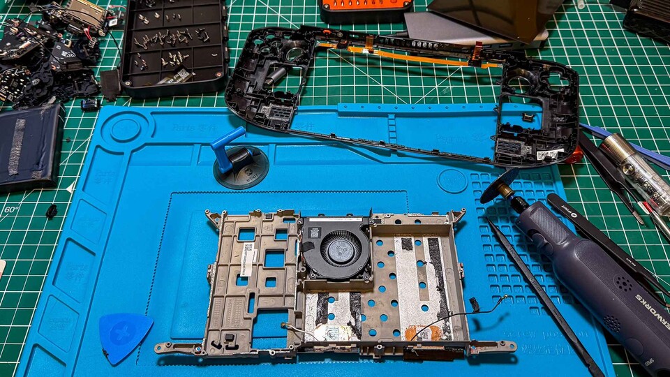 - Das Steam Deck muss anschließend in alle Einzelteile zerlegt werden. Praktischerweise sitzt das Mainboard und der Akku auf einem Metall-Rahmen, den der Modder weiterverwenden konnte. Er muss ihn nur etwas trimmen.