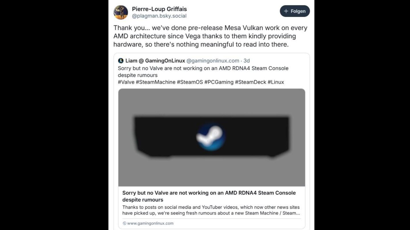 Steam Deck-Nutzer dürfen weiter träumen: Gerüchte besagen, dass Valve auf Basis der RDNA 4-Hardware an einer Konsole arbeite. Jetzt meldete sich Pierre-Loup Griffais, ein leitender Steam Deck-Entwickler, zu Wort.