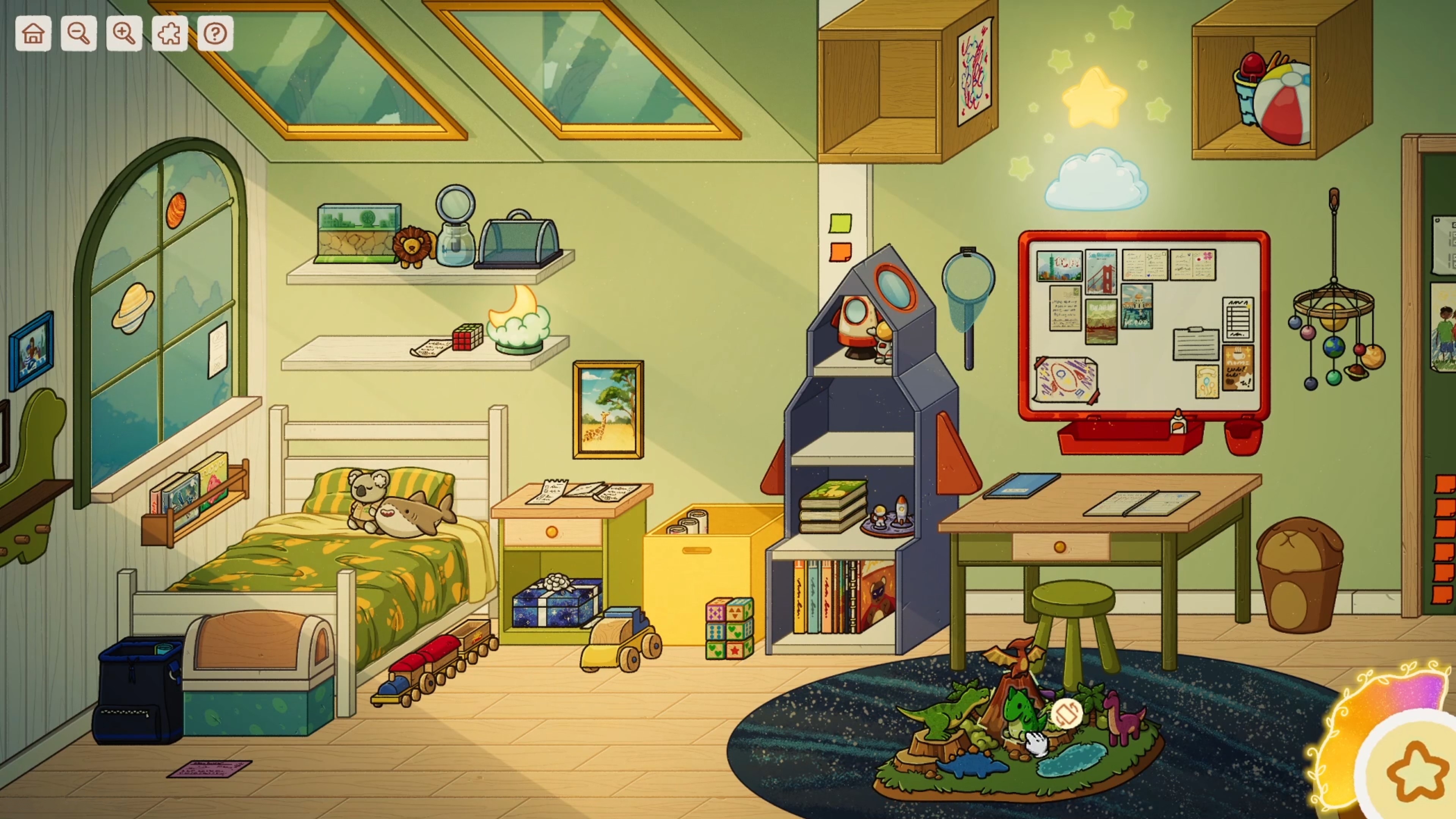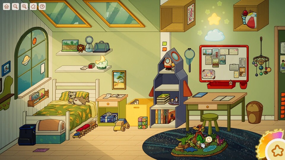 Sobald ich alle Momentos gefunden habe und der Meinung bin, genügend Rätsel gelöst zu haben, kann ich fortfahren. Dann macht das Spiel einen Zeitsprung. Es ist immer noch Sams Zimmer, doch nun liegen Schulbücher auf dem Schreibtisch und der Kuscheldino ist vom Bett ins hinterste Regal gewandert. Kein Zweifel: Sam ist älter geworden. Wieder mache ich mich daran, die Unordnung zu beseitigen und dabei durch die Momentos Entscheidungen zu treffen.