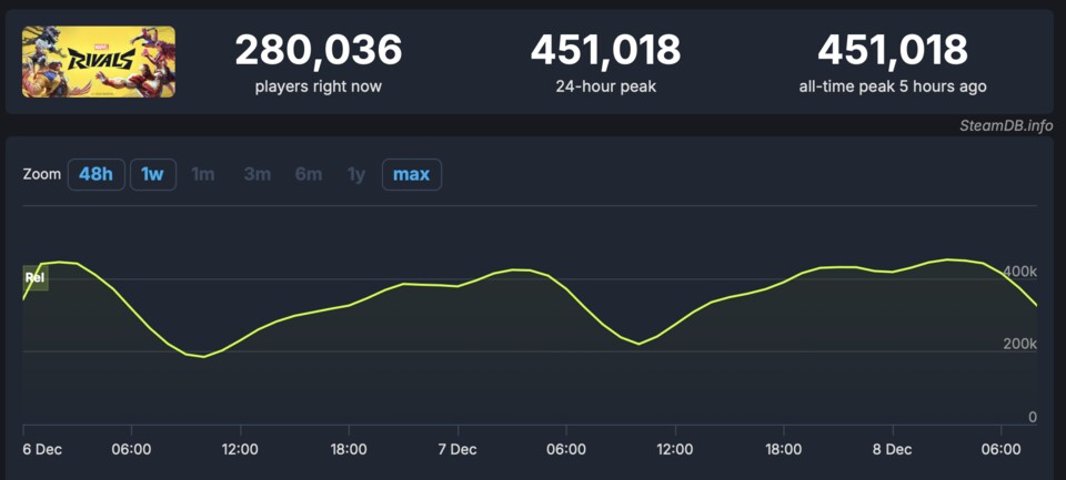Die beiden neuen Steam-Giganten machen es also unter sich aus. Marvel Rivals legt schon einmal gut vor. In dem Superhelden-Hero-Shooter tummeln sich momentan 280.036 Avengers. In der Spitze waren es 451.018 Eisenmänner, Adleraugen und amerikanische Captains.