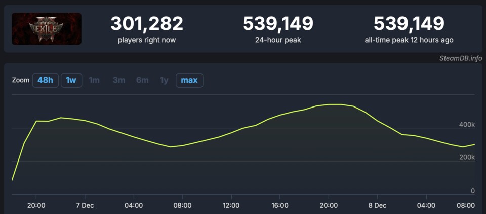 Auf SteamDB ist es ein eindrucksvolles Bild, das sich einem derzeit bietet. Sowohl Path of Exile 2 als auch Marvel Rivals kratzen an der Marke von 500.000 gleichzeitigen Spielern.