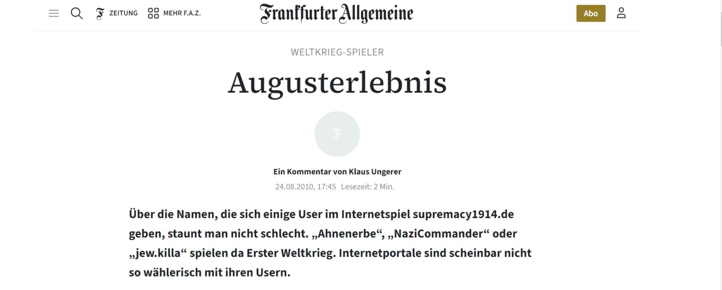 2010 kritisiert die Frankfurter Allgemeine Zeitung die Fülle der rechtsextremen User-Namen im Spiel supremacy1914.de und folgert: »Internetportale sind nicht wählerisch mit ihren Usern.« Durch den Artikel sei Bytro Labs »damals in den Fokus geraten als Beispiel für Rechtsextremismus in Spielen« erklärt McGinley die anfängliche Zurückhaltung, ein Interview mit uns zu führen.