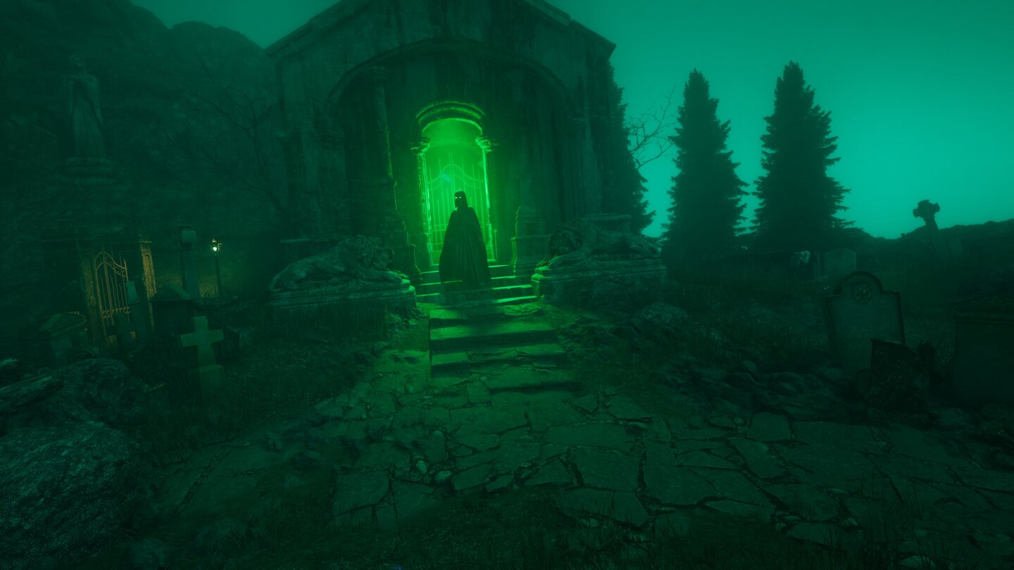 Statt einer monotonen Kulisse erlebe ich in The Occultist einen richtigen Sightseeing-Ausflug. Ich starte in einem nebligen Wald – und werde direkt von der Grafik-Wucht des Indie-Spiels erschlagen. Kein Wunder: Die Entwickler haben nämlich ihre Wurzeln in der professionellen Architektur-Visualisierung und 3D-Animation. Befeuert von der Unreal Engine 5 merke ich diese Expertise jedem einzelnen Umgebungs-Pixel an.