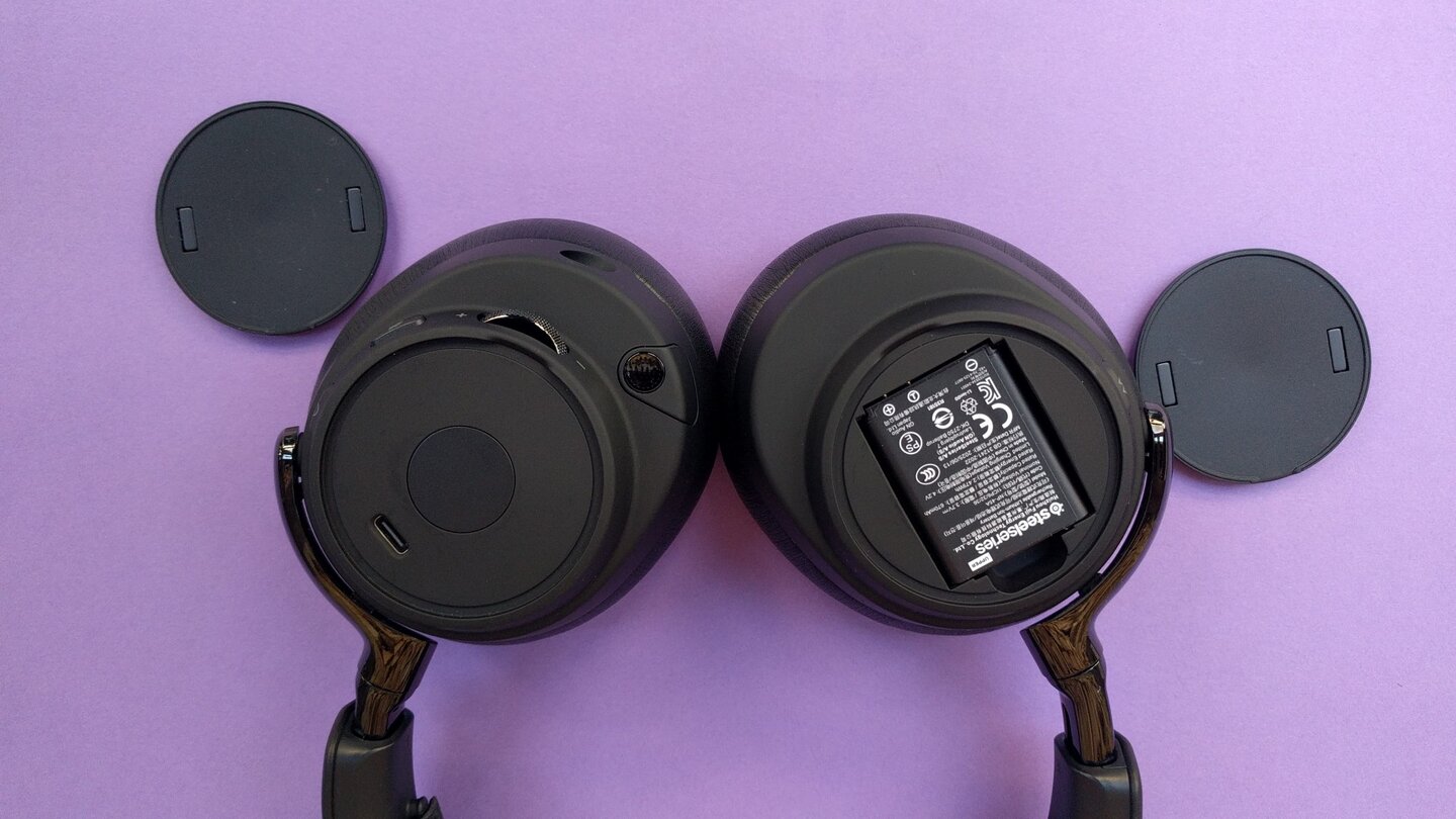 Der andere Akku befindet sich bereits im Headset und das Mikrofon im Inneren der linken Ohrmuschel. Es lässt sich ein- und ausfahren, aber nicht abnehmen.