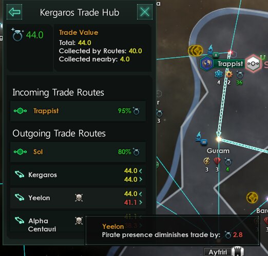 Piratenangriffe kosten an betroffenen Handelsrouten Wirtschaftswert. Wenn wir also nicht aufpassen, erreichen keine Waren unser Kernsystem und wir verlieren an Wirtschaftskraft. Der Ausbau von Sternenbasen sorgt für höheren Schutz in unmittelbarer Umgebung durch Eskorten für die Händler, am Ende sollten wir aber auch eine Schutzflotte abstellen und entlang der Handelsroute auf Patrouille schicken.