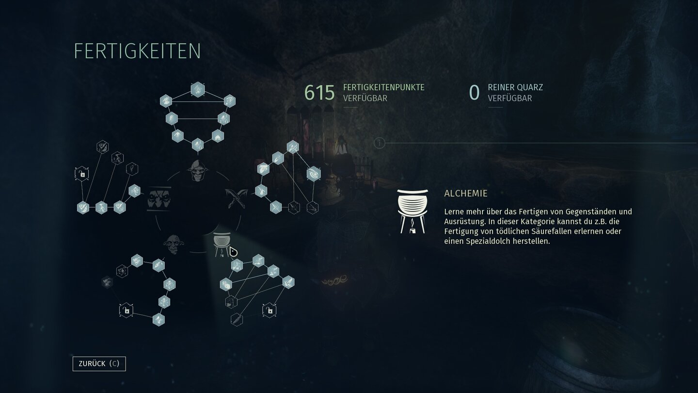 Nach jeder Mission verteilen wir die darin verdienten Erfahrungspunkte auf Fähigkeiten in einem mehrstufigen Talentbaum. So lernt Styx neue Fallen und Gegenstände wie vergiftete Pfeile herzustellen oder verlängert die Dauer seines Unsichtbarkeitszaubers. Am Ende eines jeden Fertigkeitbaums stehen zwei besonders mächtige Fähigkeiten, die zusätzlich einen »reinen Quarzstein« erfordern und erst »sichtbar« werden, wenn die Fertigkeiten darunter freigeschalten sind. Die Quartzbrocken sind als optionale Aufgaben in den Missionsgebieten zu finden. Erlernte Fähigkeiten lassen sich im Unterschlupf auch wieder »verlernen« und die Punkte ohne Strafe neu verteilen, sodass ein Anpassen an den eigenen Spielstil oder eine besonders knifflige Mission jederzeit möglich ist.