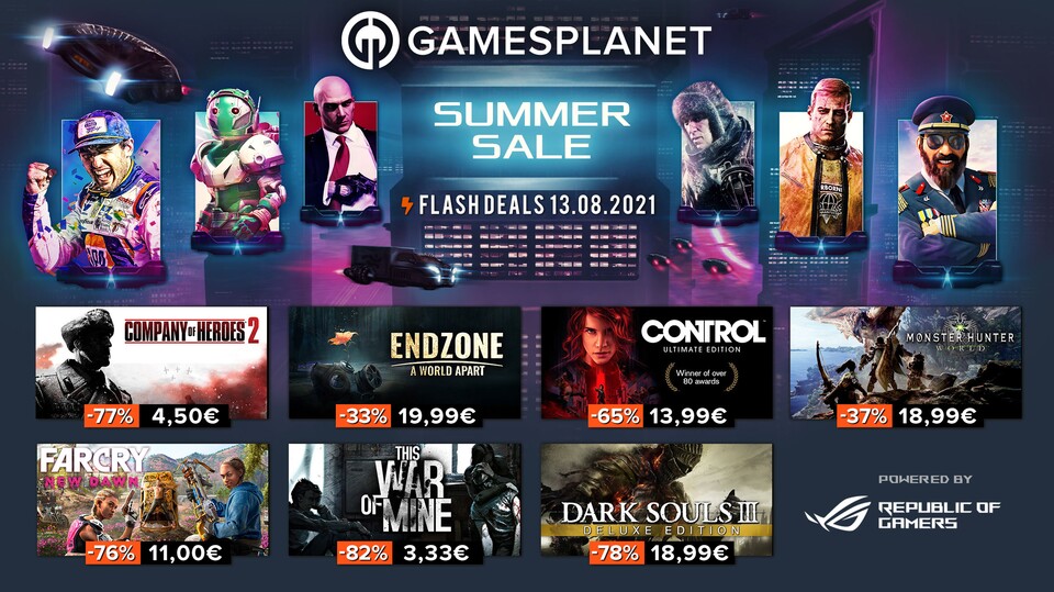 Achtung: Bei den hier aufgeführten Angeboten handelt es sich um Flash Deals des Gamesplanet Summer Sales. Diese sind immer 24 Stunden lang verfügbar, jeden Tag um 10 Uhr gibt es neue Angebote.