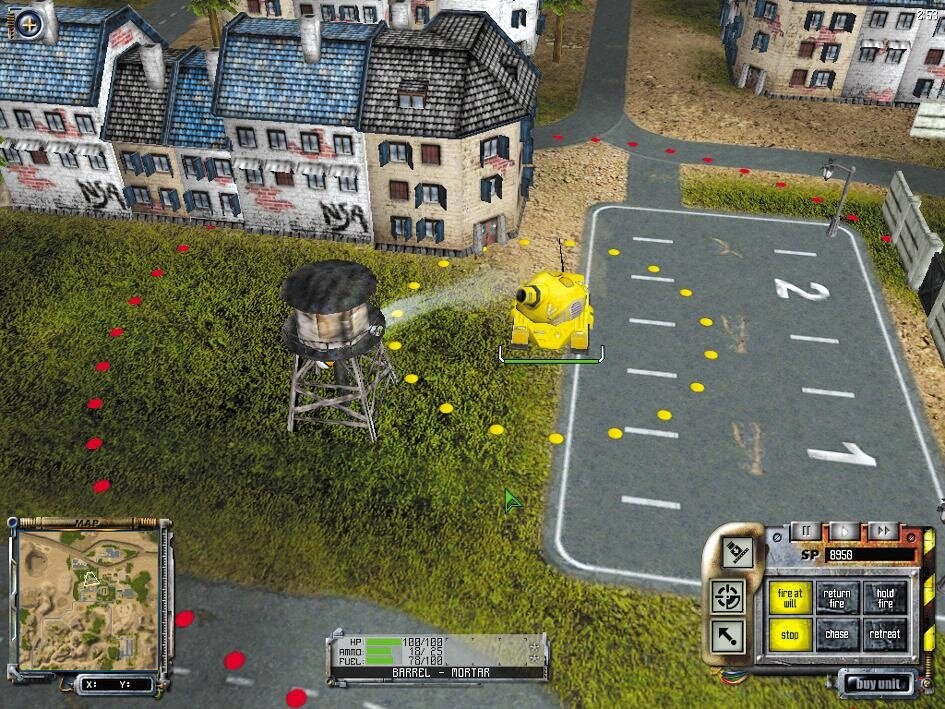 Große Geschütze feuern naturgemäß weiter als kleine Kanonenröhrchen. Deshalb haben schwer bewaffnete Gefährte auch eine größere Mindestreichweite. Wenn Sie es also schaffen, mit einer flinken Einheit nahe an einen Feindpanzer heranzufahren, sind Sie dort vor seinen Schüssen sicher und beharken ihn in aller Ruhe. Auf Hügeln postierte Kämpfer sehen zwar weiter, Treffsicherheit oder Waffenradius verbessern sich durch den erhöhten Standort allerdings nicht.