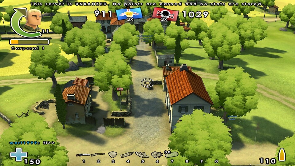 Obwohl Battlefield Heros mittlerweile schon einige Jahre alt ist, gibt es immer noch viele Server. Das interne Matchmaking über den »Jetzt Spielen«-Knopf funktioniert allerdings nicht immer einwandfrei, weil nicht immer genügend Spieler mit geringem Level online sind. Wenn wir einen Helden mit höherem Level spielen oder den internen Server-Browser verwenden, finden wir aber immer ein belebtes Spiel.