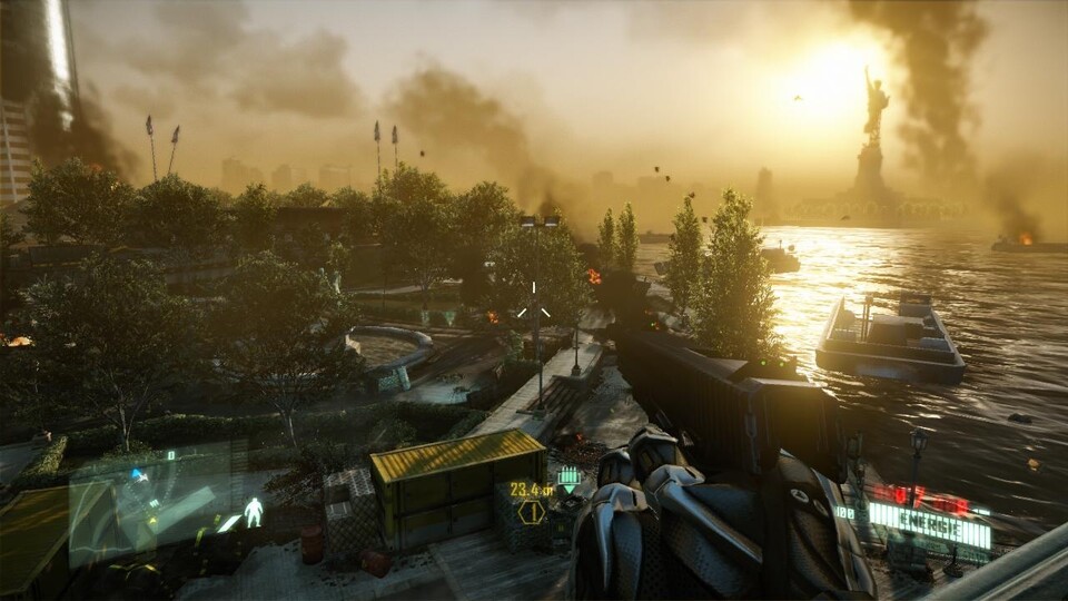 Da Crysis 2 nur in drei Einstellungen gespielt werden kann, stellen wir ausgewählte Gegenden in den drei Detailstufen »Hoch«, »Sehr Hoch« und »Extrem« gegenüber und weisen auf die teils nur minimalen Unterschiede hin. Auf die Leistung haben die Grafikoptionen trotz der nur marginalen Änderungen aber einen gewaltigen Einfluss. Stellenweise läuft Crysis 2 gut 50 Prozent schneller, wenn Sie den Detailgrad von »Extrem« auf »Sehr Hoch« reduzieren.