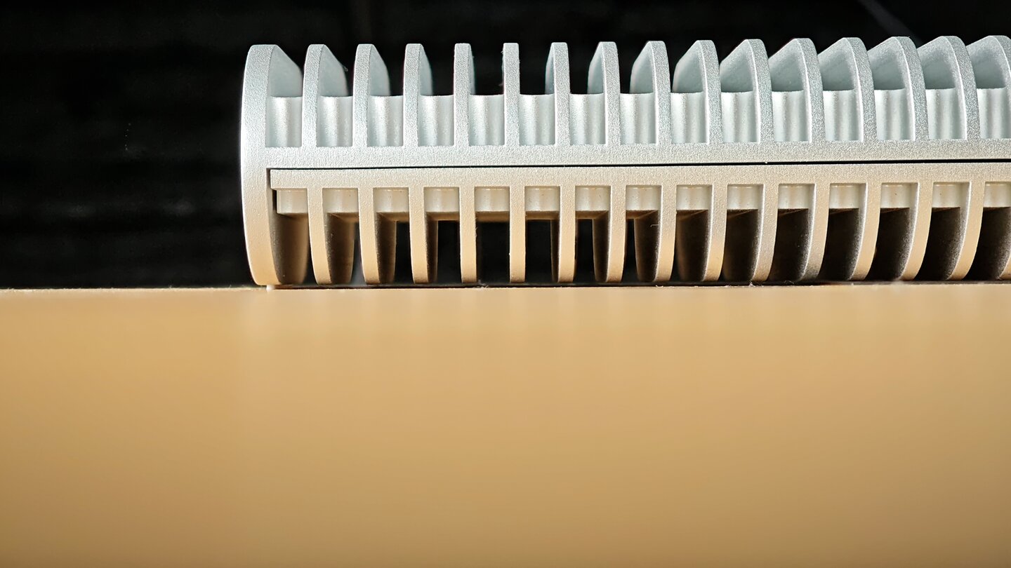 Ein kleines, aber aufmerksames Detail sind die dünnen Gummistreifen auf der Unterseite. Dadurch schweben die unteren Kühlrippen einen Millimeter über dem Tisch, was die Luftzirkulation geringfügig verbessert und für festen Halt auf dem Tisch sorgt.