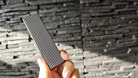 Hochwertig und kühl: Das Gehäuse besteht vollständig aus Aluminium und fühlt sich extrem hochwertig an. Außerdem gibt es zahlreiche Kühlrippen. Das ganze Modell ist praktisch ein einziger Kühlkörper für die SSD, die sich in der Mitte befindet. Ein beigefügtes Wärmeleitpad sorgt dafür, dass sich die Hitze der SSD auf das Metall verteilt.