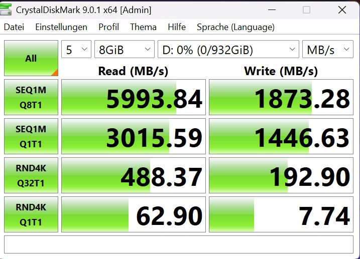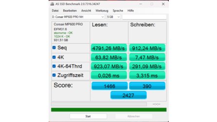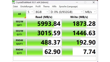 Das tut sie zumindest in unseren Tests allerdings nicht. Im AS SSD Benchmark erreicht die SSD beim sequenziellen Lesen 4.791,26 MB/s, während wir beim CrystalDiskMark 5.993,84 MB/s ermitteln konnten.