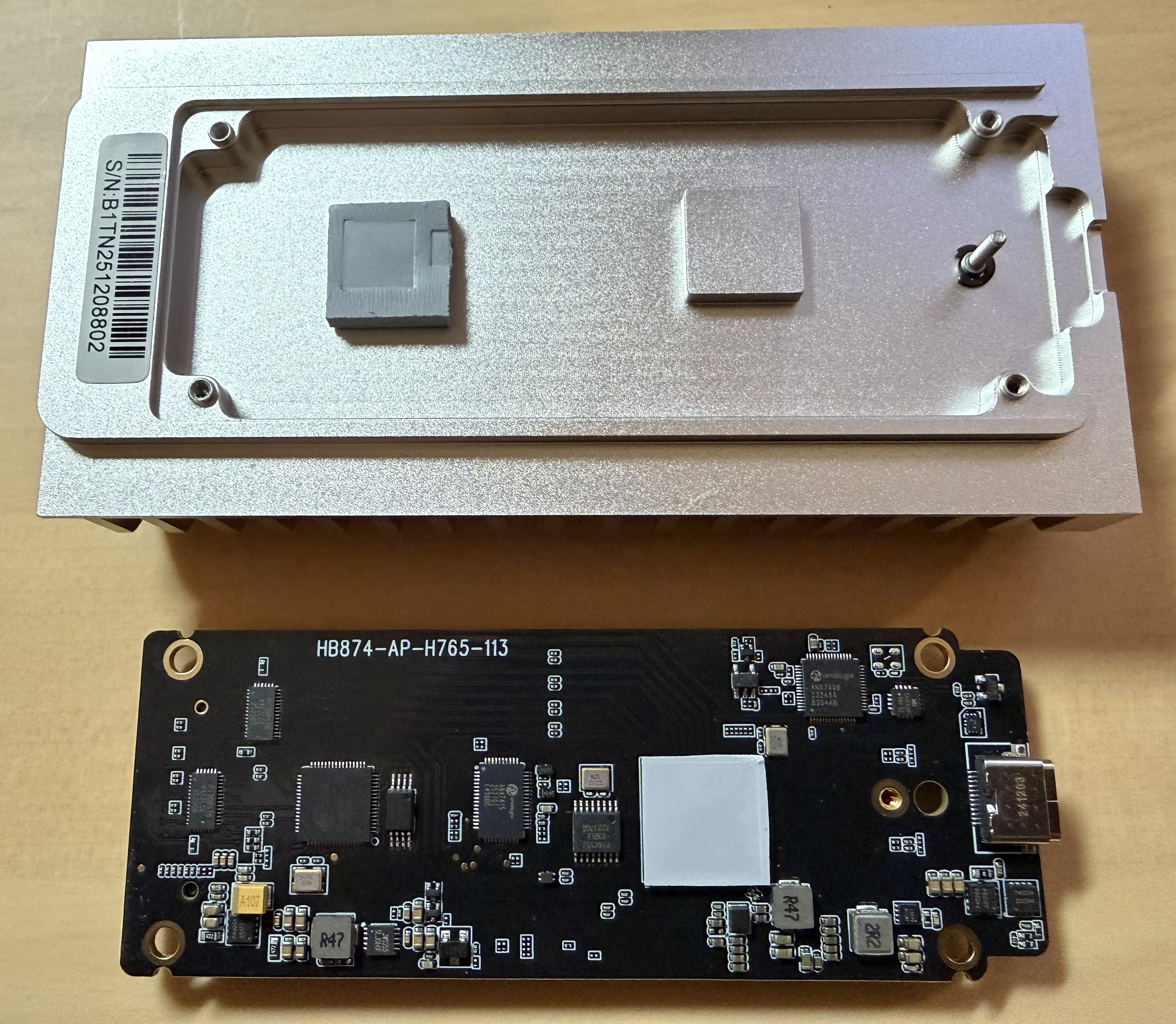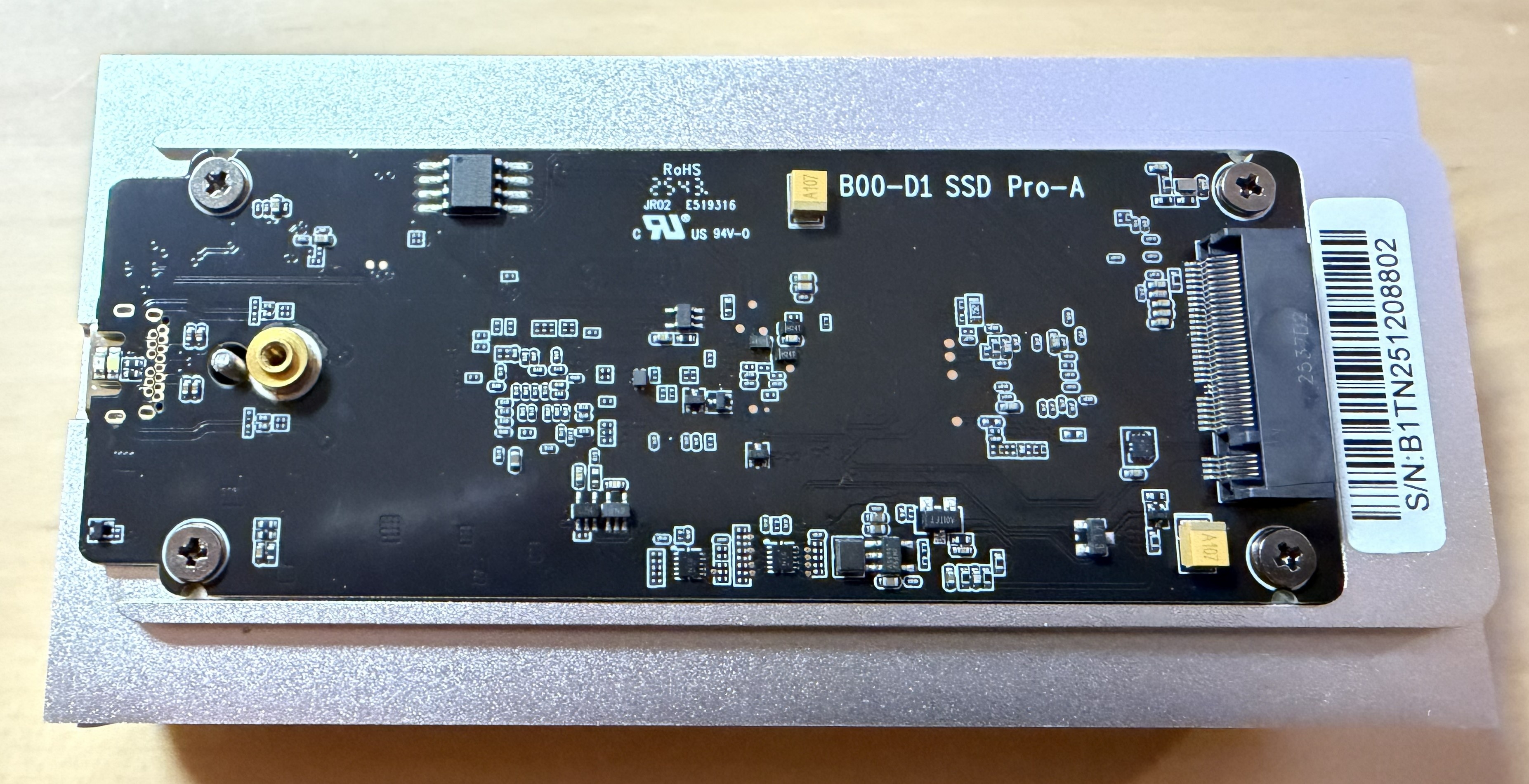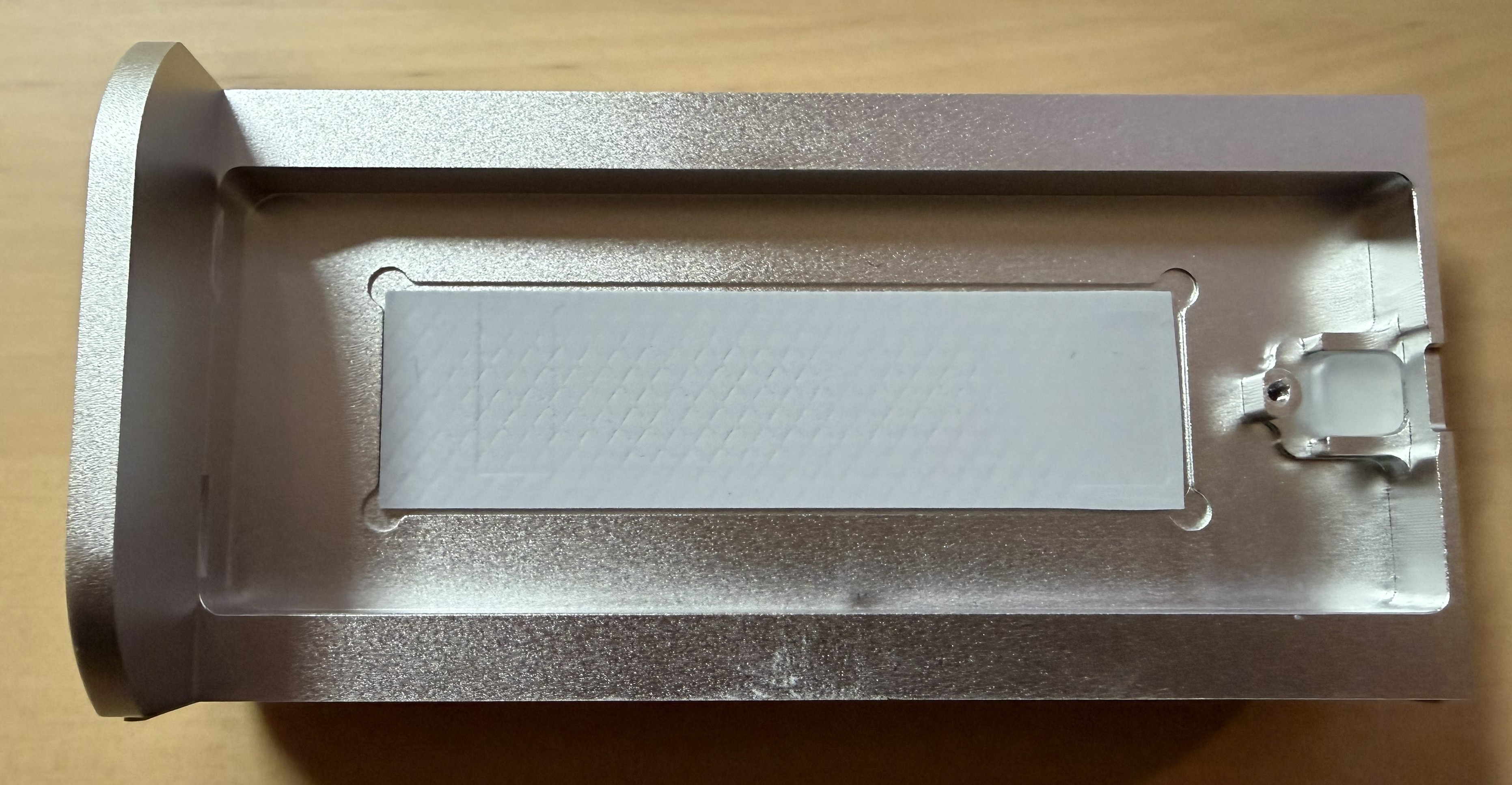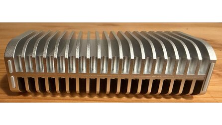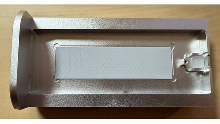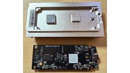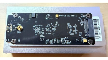 Sehr schön und längst nicht bei jedem externen SSD-Gehäuse üblich: Auf der Rückseite besitzt der Controller-Chip ein eigenes Wärmeleitpad und hat direkten Kontakt zur Aluminiumhülle. Das sollte auch bei längerer Belastung für einen stabilen Betrieb sorgen.