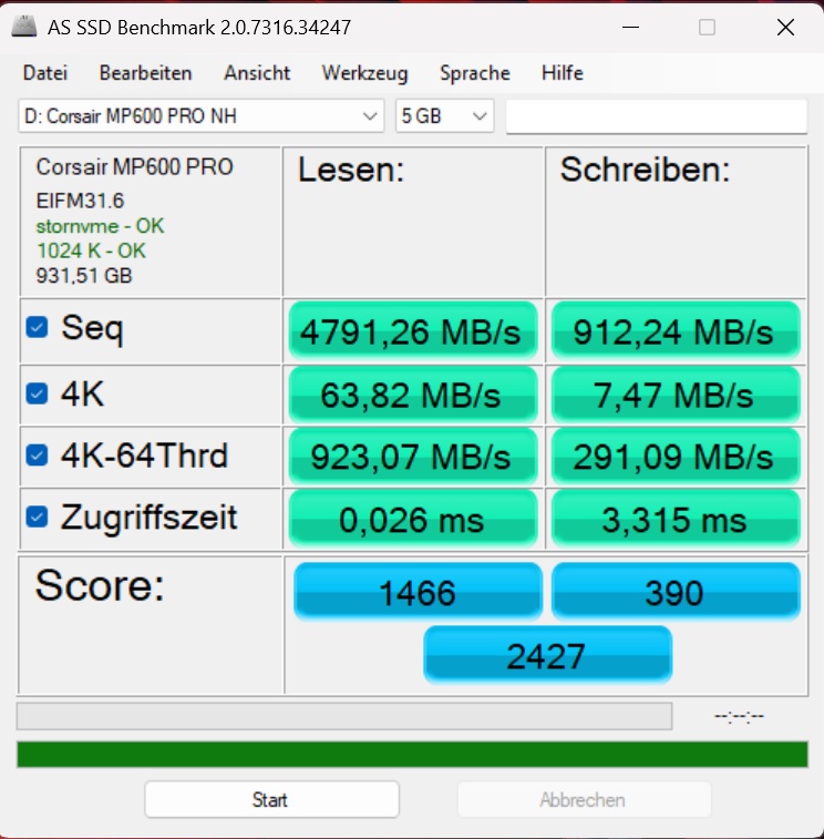 Für die Benchmarks verwende ich eine Corsair MP600 Pro, die laut Hersteller beim sequenziellen Lesen eine Geschwindigkeit von bis zu 7.000 MB/s erreichen kann.