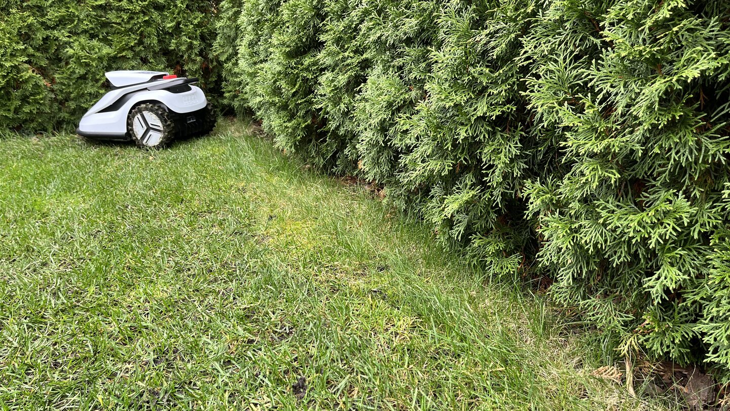 Aber: Perfekt ist die automatische Kartierung keinesfalls. Gelbes oder spätestens abgestorbenes Gras erkennt der TerraMow nicht mehr als Rasen – und spart die Fläche aus. Zudem erkennt er neben Steinen oder Gemüsebeeten auch meine Koniferen als Begrenzung (logisch!), weswegen er das Gras nicht bis zur Kante mäht.