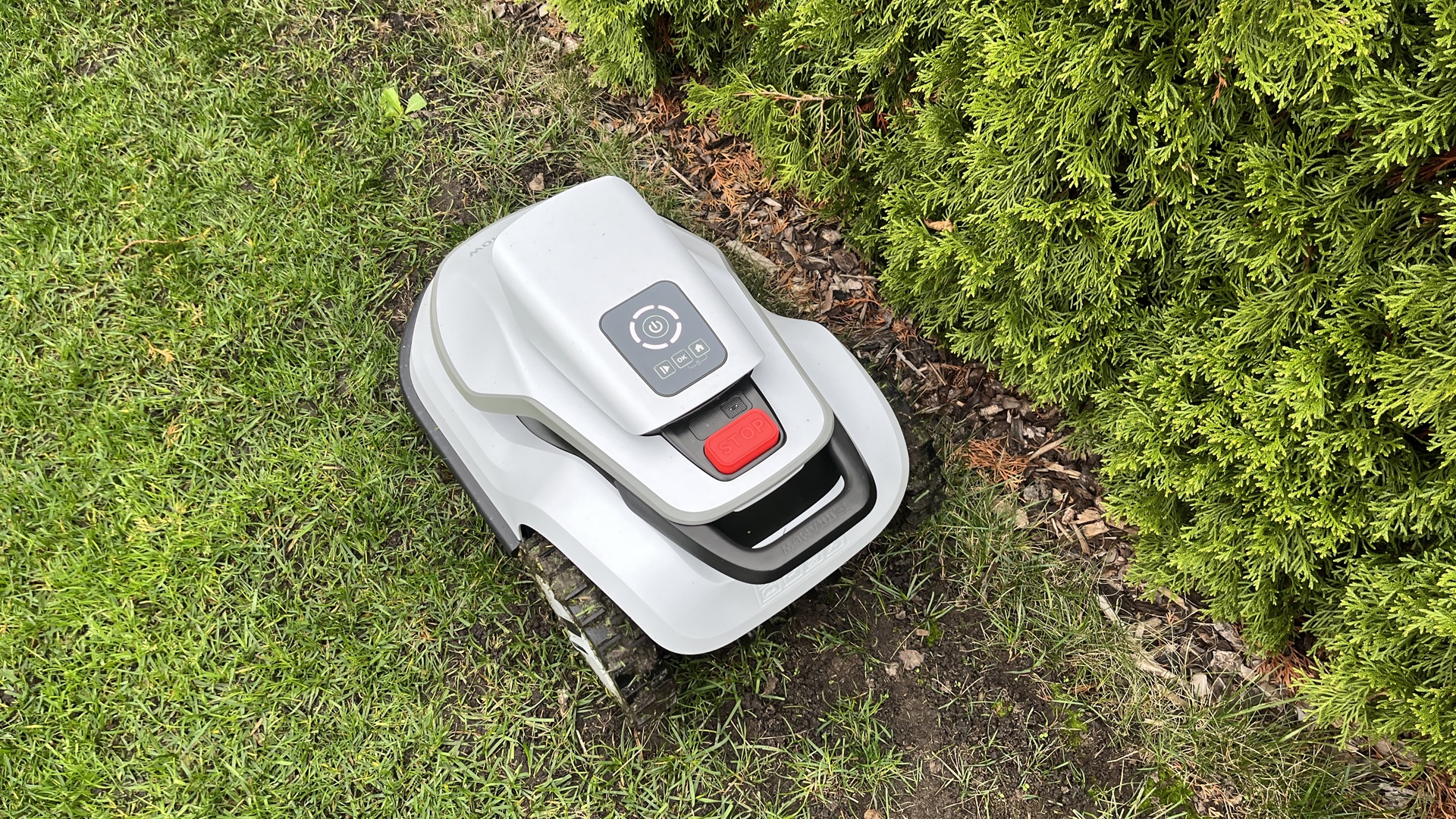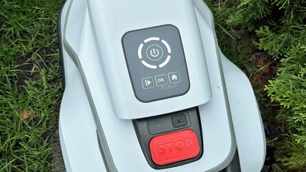 Statt eines Displays gibt es auf der Oberseite drei simple Knöpfe für die wichtigsten Funktionen, wie Start/Stopp oder das nützliche Spot-Mähen, falls ihr mal schnell eine bestimmte Stelle ohne App mähen lassen wollt.