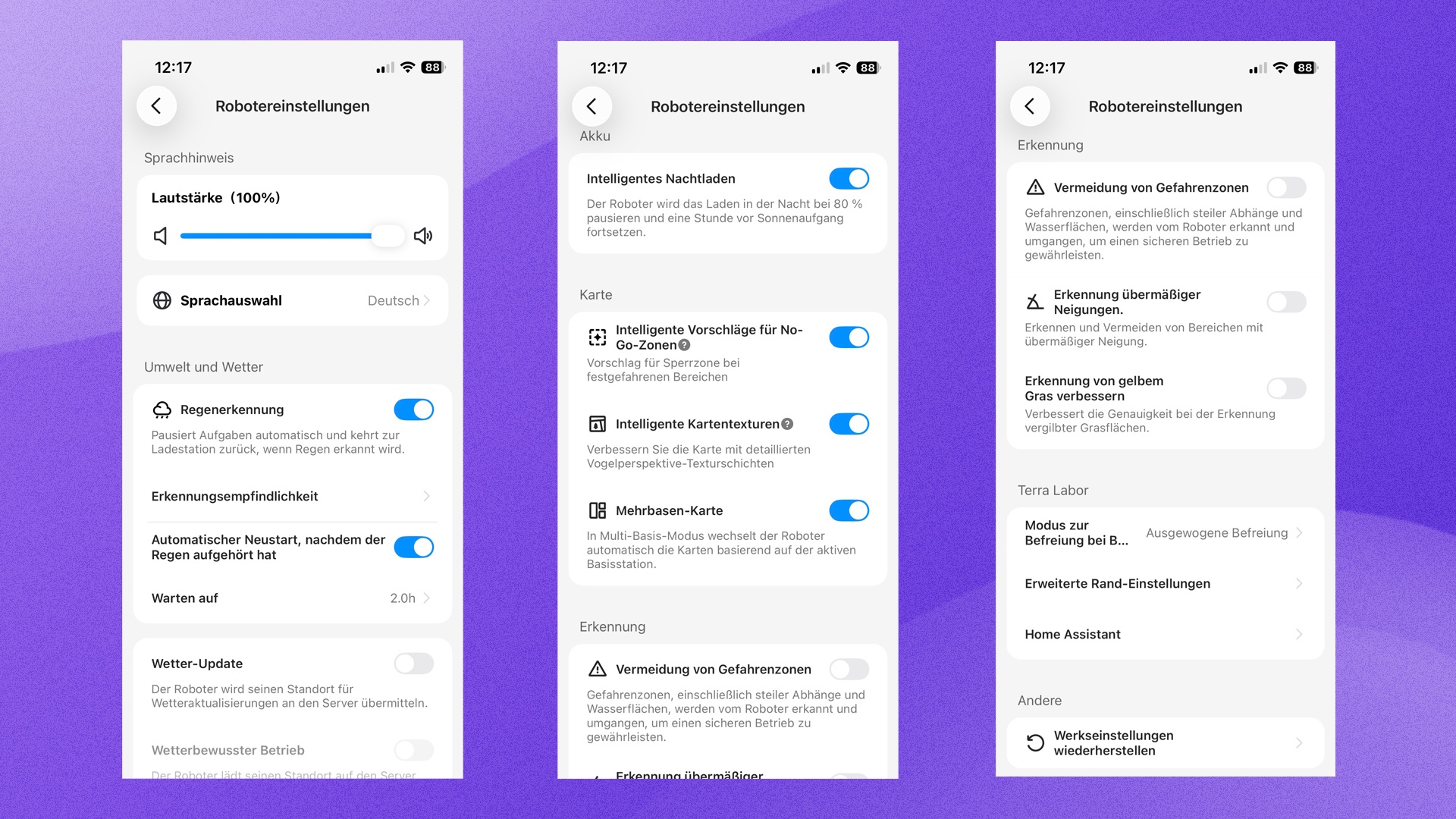 - Wetterdatenbezug: Neben dem Regensensor berücksichtigt der Roboter bei Bedarf auch Wetterdaten.