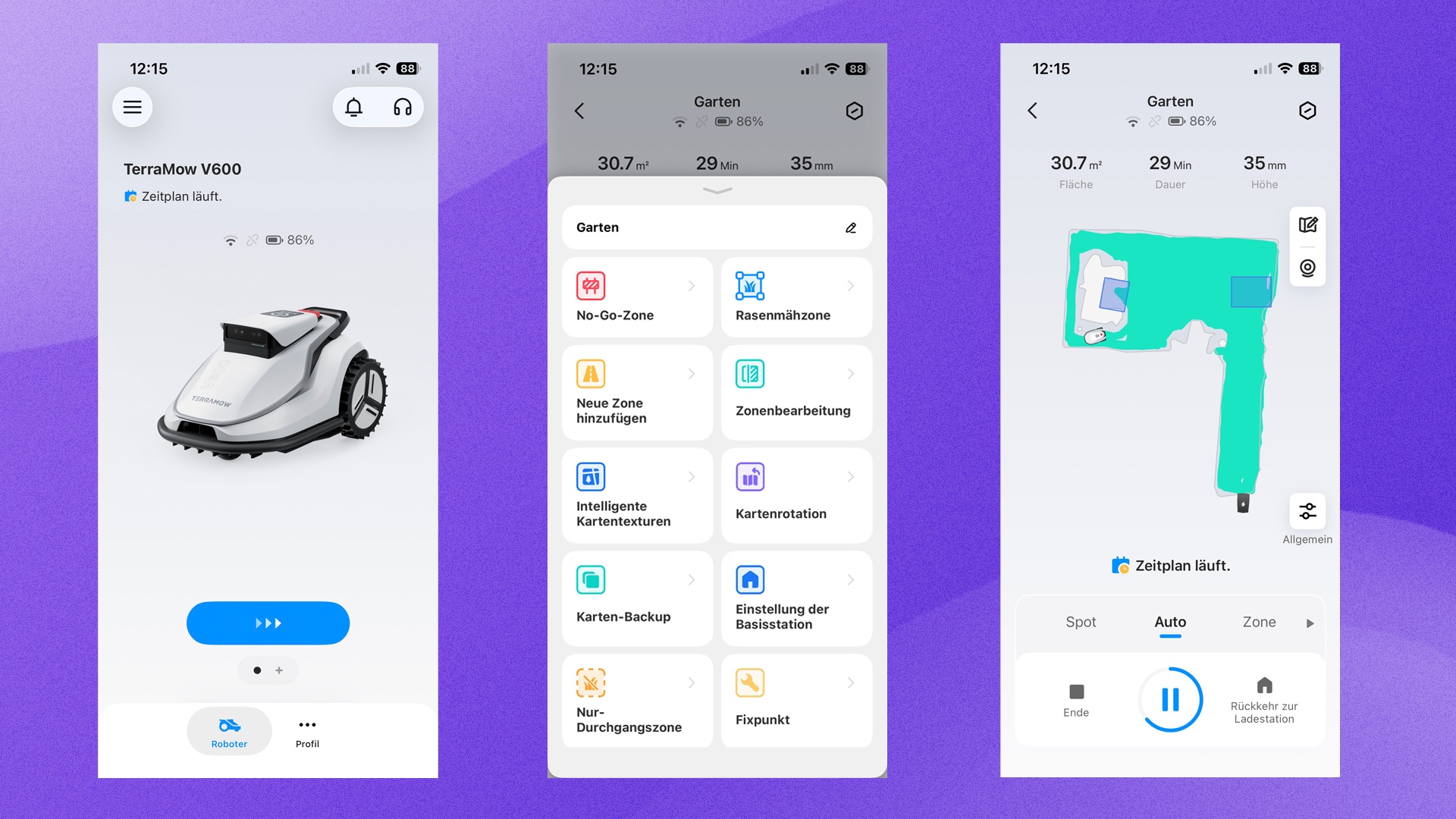 - TerraMow V600: Ausgelegt für Rasenflächen bis zu 600 m². Er hat eine Akkulaufzeit von bis zu 120 Minuten.