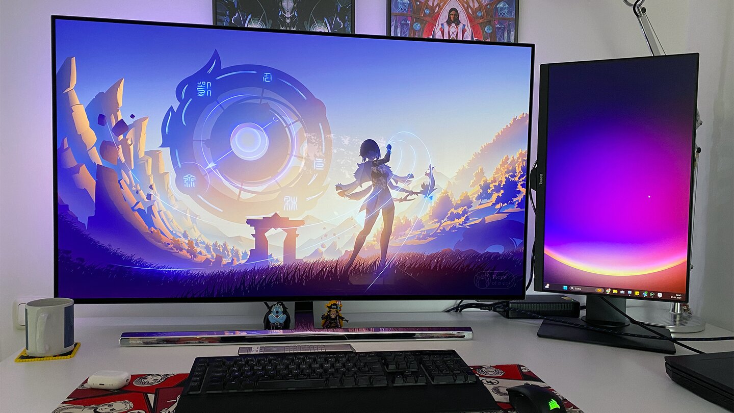 Zugegeben, beeindruckend sieht Pratchetts Schreibtisch schon aus; sechs Monitore machen was her. Was mich an mehreren Displays schon immer gestört hat, sind die Ränder und Limitationen. Deshalb habe ich mich für einen 48-Zoll-OLED-TV entschieden.