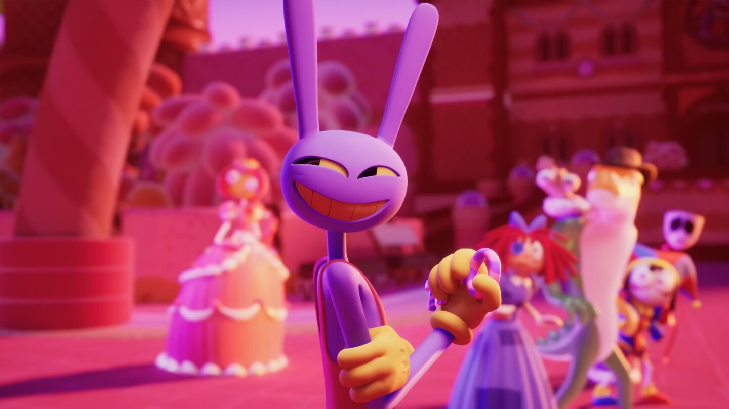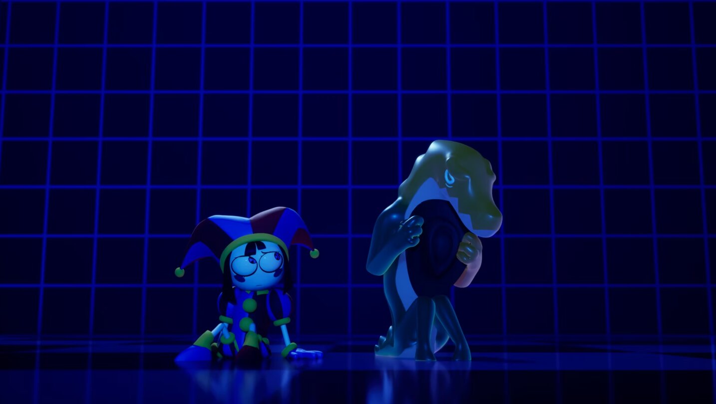 Durch die Folgen hinweg wird die zusammengewürfelte Gruppe aus Gefangenen immer wieder von einer AI namens Caine (Alex Rochon) auf Abenteuer geschickt, die ein wenig an diverse Videospiele erinnern. Und mit erinnern meine ich nicht nur, dass die Reise zum Beispiel in ein Action-Adventure im Süßigkeitenland geht, sondern dass etwa Ponmi und ein NPC aufgrund eines Glitches durch die Map fallen, woraufhin der NPC sich seiner eigenen Non-Existenz bewusst wird und deswegen beinahe dem Wahnsinn verfällt.