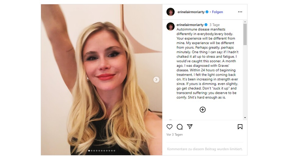 Auf Instagram spricht die 30-jährige Darstellerin davon, dass man bei ihr im Mai 2025 Morbus Basedow festgestellt hat. Auch bekannt als Basedowsche Krankheit oder auch Graves-Erkrankung, handelt es sich dabei um eine Autoimmunerkrankung, die sich meist direkt auf die Schilddrüse auswirkt.