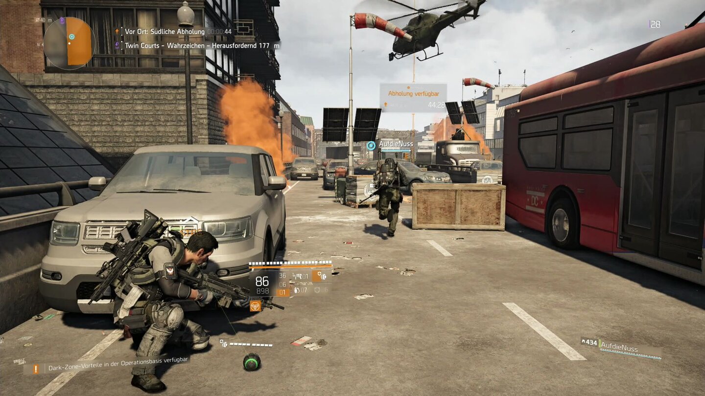Denn wenn ihr, ähnlich wie in der Dark Zone, allein rumlauft und von zwei Gegnern gleichzeitig unter Beschuss genommen werdet, habt ihr keine Chance.