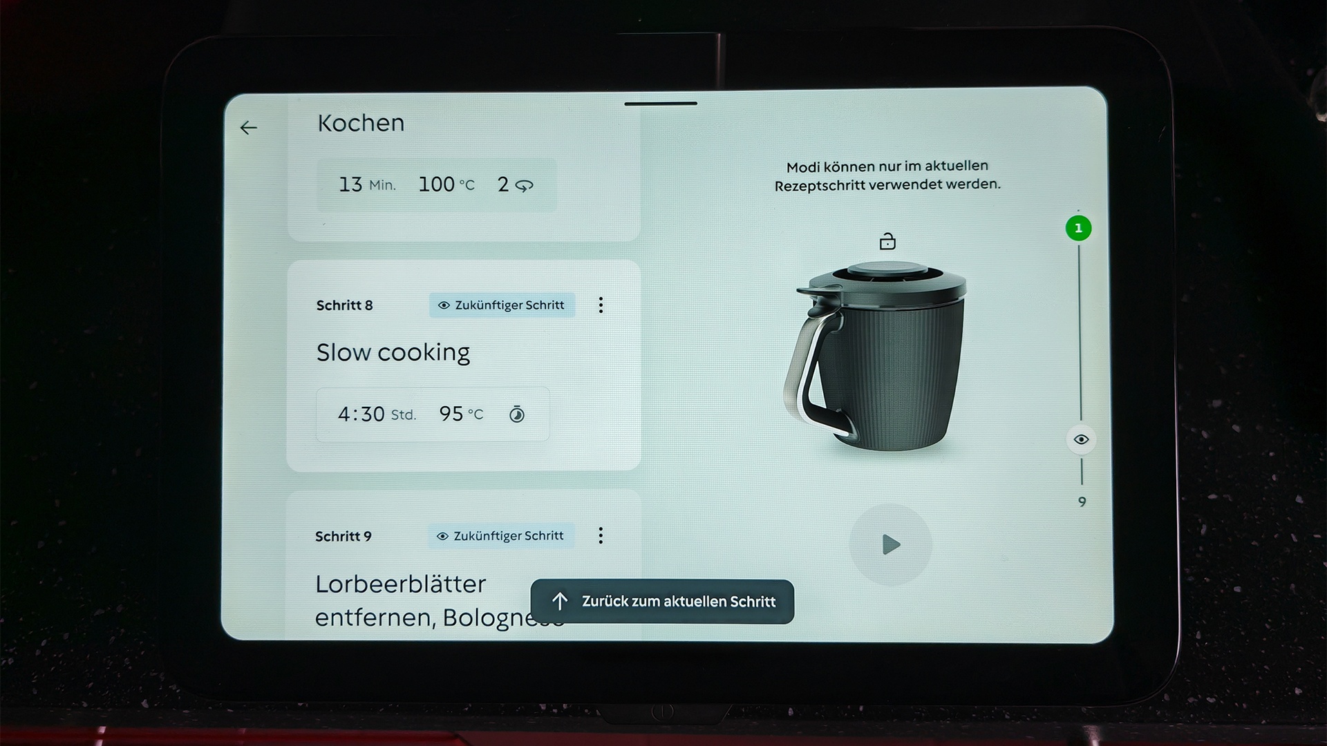 Nutze ich Cookidoo, die hauseigene Rezeptbibliothek, bekomme ich bei jedem Rezept erst mal eine allgemeine Übersicht und hangle mich dann mit einer Schritt-für-Schritt-Anleitung durch die Zubereitung.