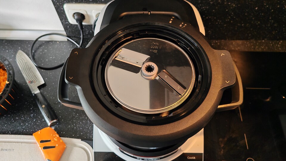 Das wird besonders dann nervig, wenn man zuerst Zwiebeln für ein Gericht zerkleinern soll, dessen Zutaten danach im Cookit angebraten werden. Die Zwiebelreste bekommt man nämlich nie restlos raus, ohne den Topf sauberzumachen, weswegen sie anbrennen. In so einem Fall habe ich lieber zum Messer gegriffen.