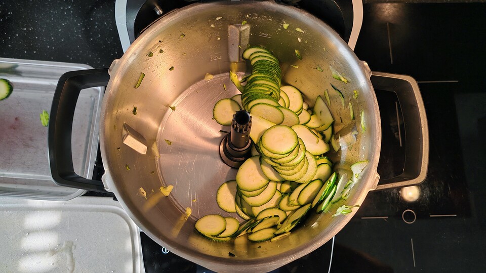 Dass der Topf so breit ist, liegt daran, dass man den Cookit auch als Küchenmaschine verwenden kann, um beispielsweise Zucchini in Scheiben zu schneiden oder Gemüse zu häckseln. Das geht mit dem Thermomix auch, die Aufsätze kosten aber extra.