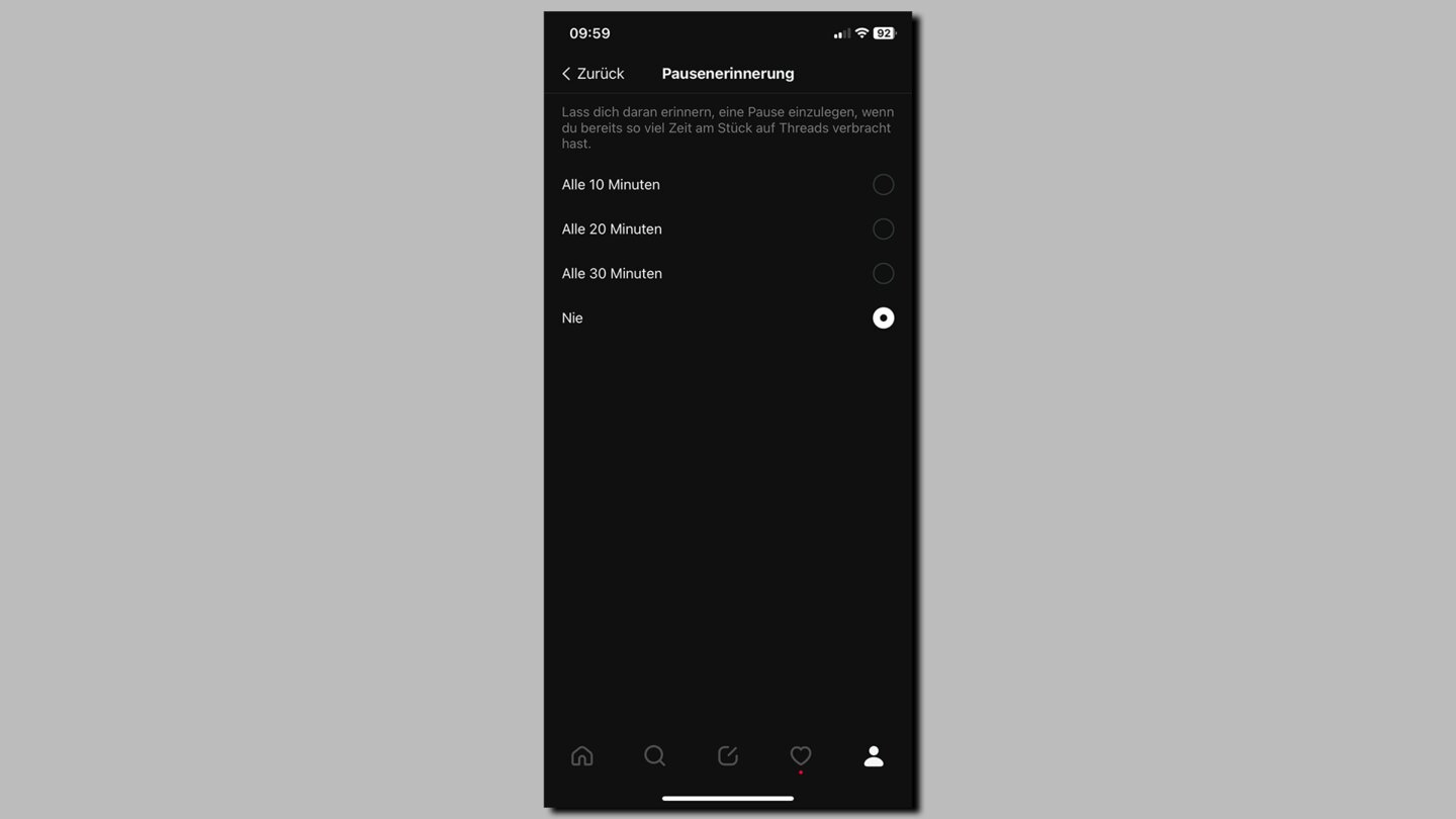 Pausenerinnerung nutzen: »Doom Scrolling«, also das endlose Durchforsten von Posts, ist eine ernste Sache und klaut Zeit. Lasst euch erinnern, wenn Schluss ist und nutzt eure Zeit weise. Threads hat eine solche Funktion direkt eingebaut.