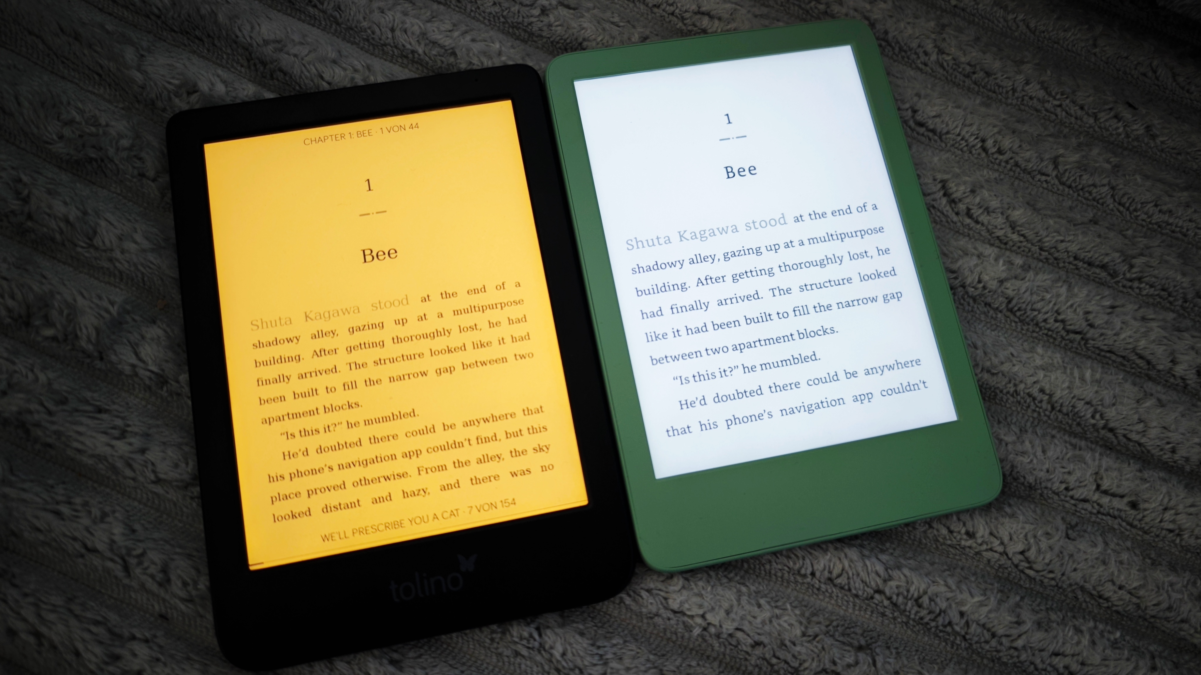 Der Text wird auf beiden Geräten knackscharf und kontrastreich dargestellt. Die Seiten erstrahlen in einem Weiß, das an Papier erinnert. Das ist beim Kindle Colorsoft und Tolino Shine Color nicht so; bei diesen Geräten sieht das Display nie wirklich ganz weiß aus.