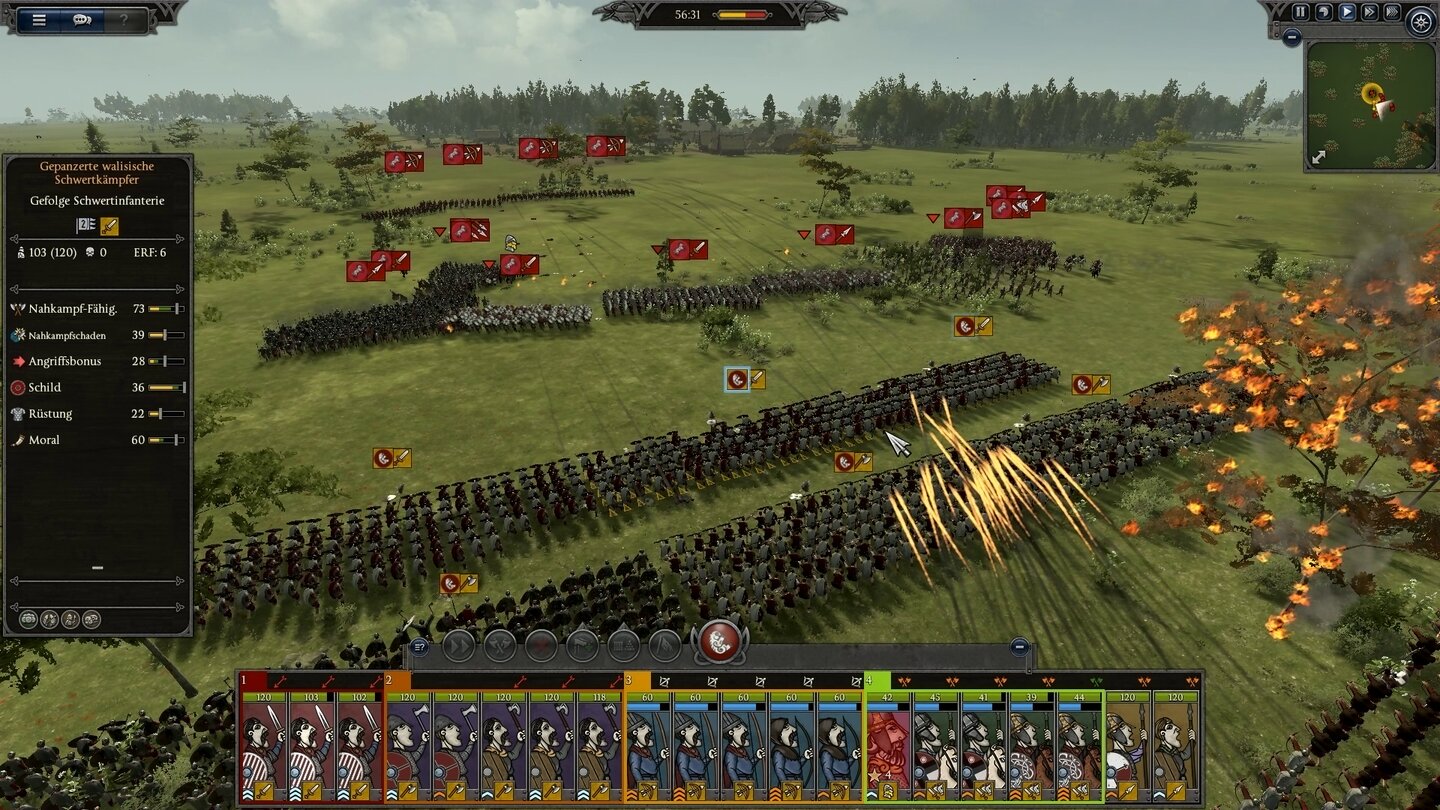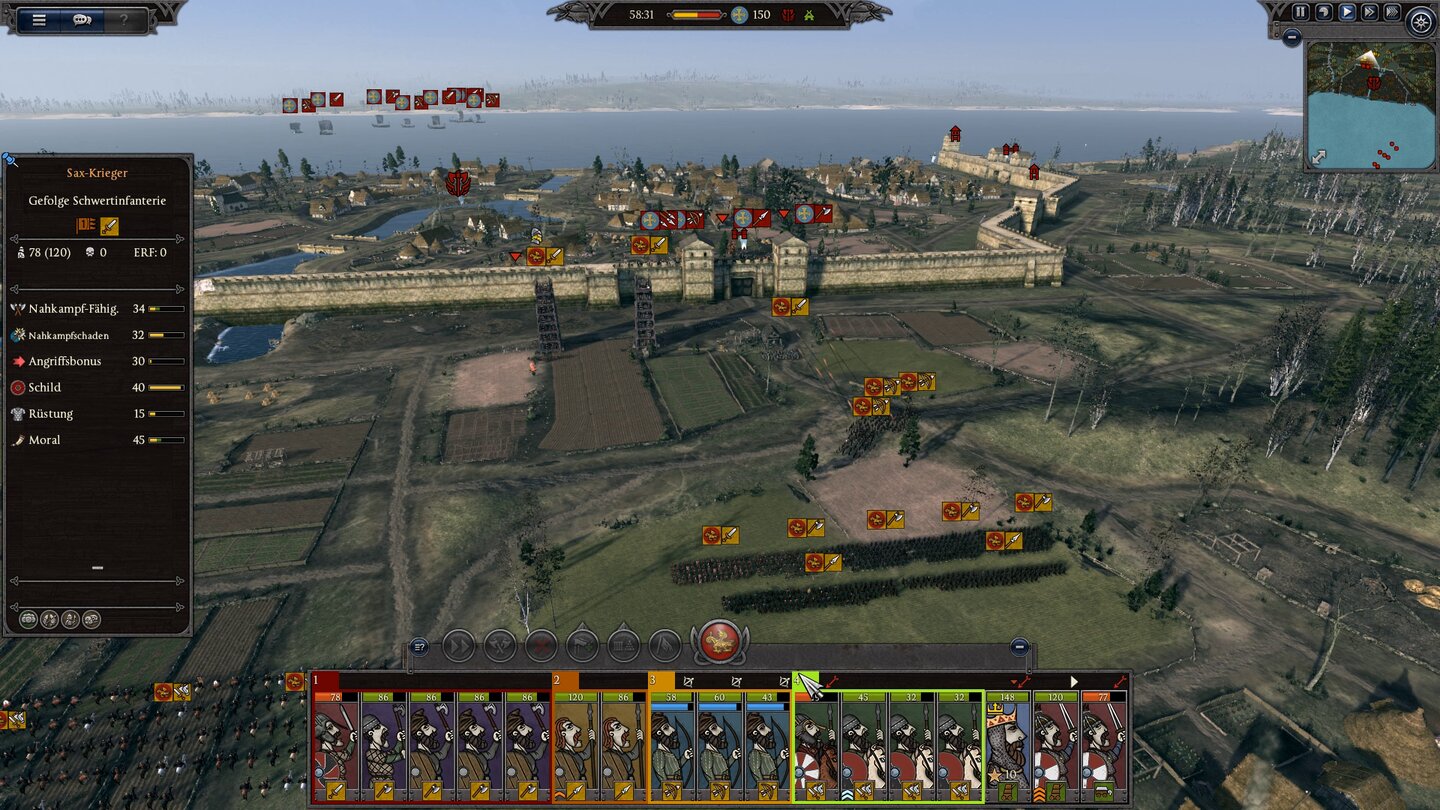 Aber die größte Schlachtenänderung ergibt sich aus der Kampagnenkarte: die Zusammensetzung unserer Armee! Weil wir nicht einfach Berge von Elite-Einheiten in die Schlacht werfen können, bestehen Streitkräfte meistens aus einem harten Kern der besten Truppen und drumherum auch mal frisch eingezogenen Bauern - wie es im Frühmittelalter eben war! So müssen wir uns clever überlegen, wo wir den Feind mit unseren besten Jungs unter Druck setzen.