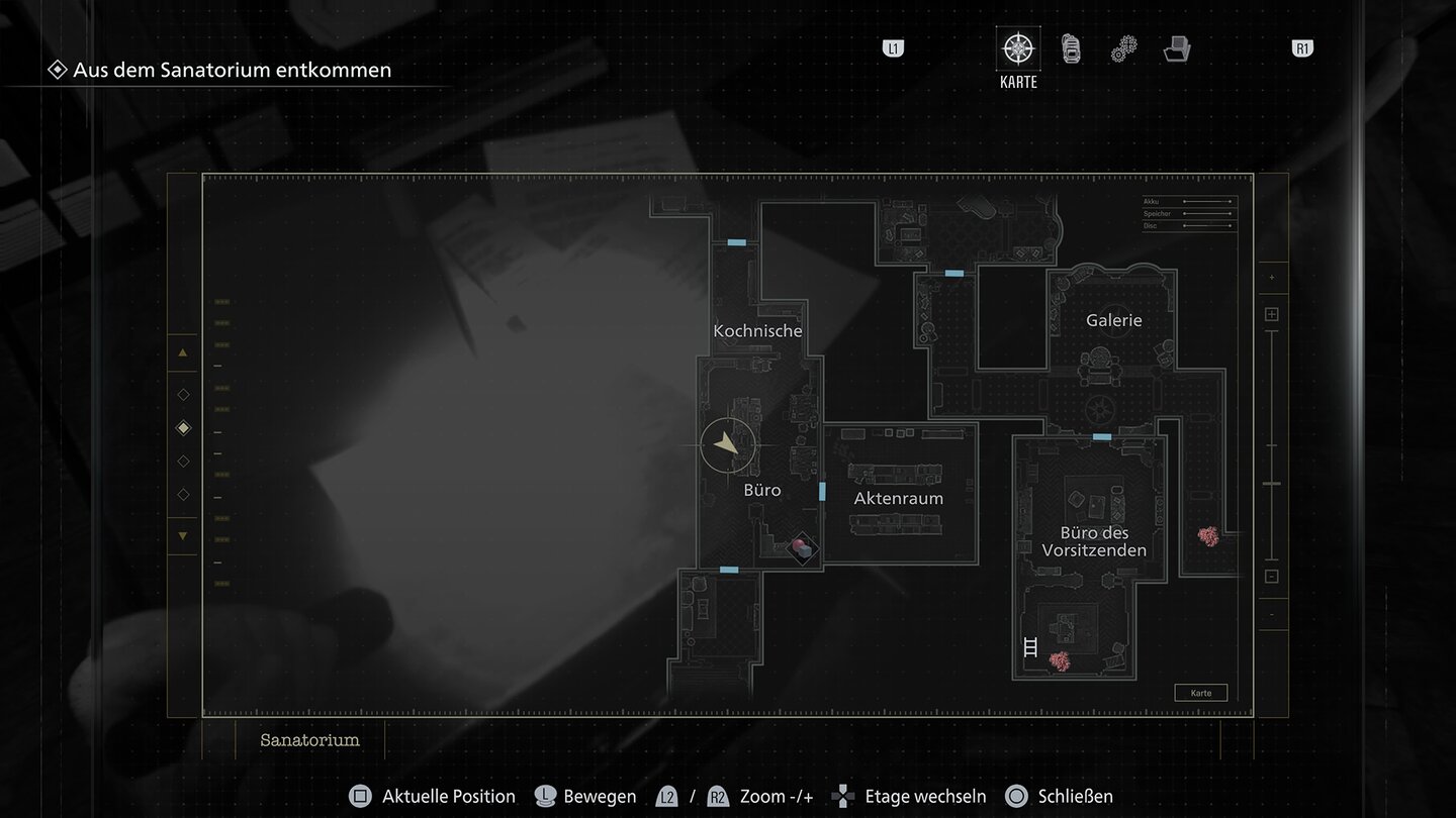Hinweis zur Akte: Die Kombination für diesen Safe findet ihr im ersten Stockwerk des Ostflügels. Geht durch das große Treppenhaus nach oben und wendet euch dann nach rechts. In dem kleinen Umkleideraum vor dem Konferenzraum liegt die Notiz auf einem umgekippten Spind in der hinteren rechten Ecke.
