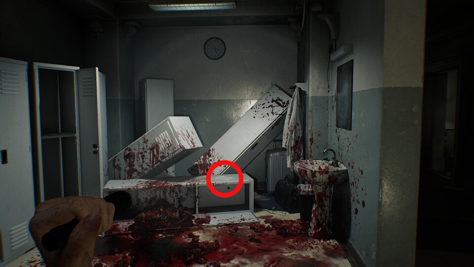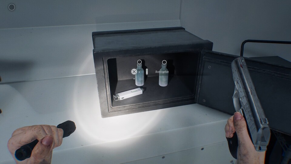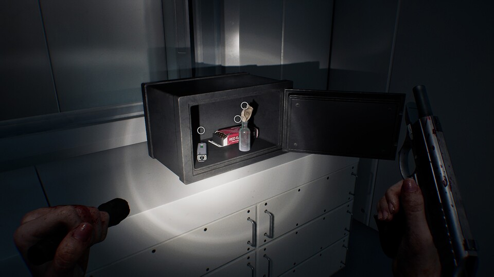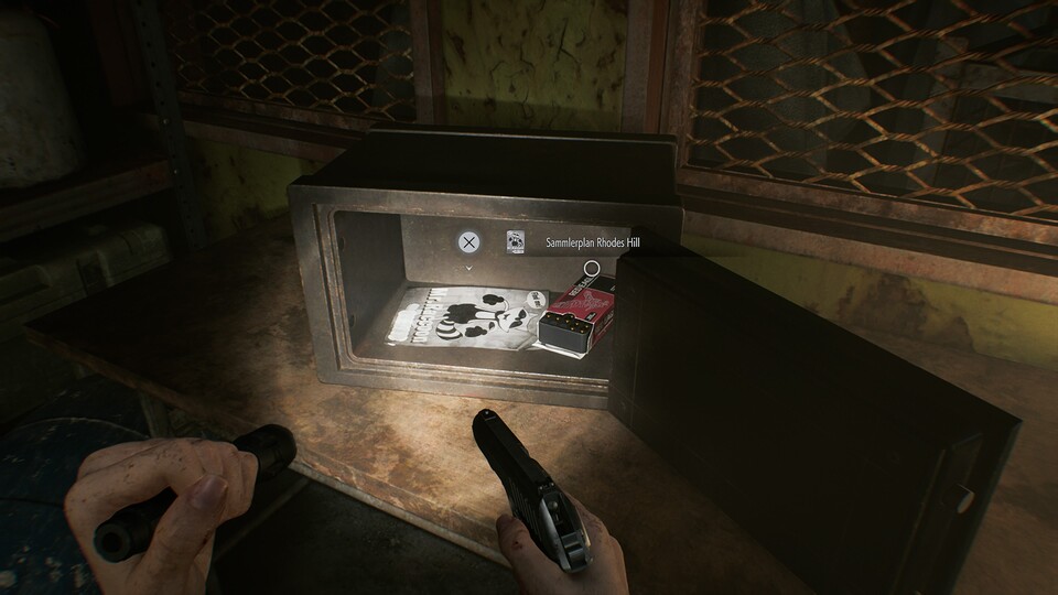Hinweis zur Akte: Die Kombination wird zunächst von Leon auf dem Dachboden entdeckt. Etwas später wechselt das Spiel zurück zu Grace im Keller, wo der Tresor bereits mit diesem Code geöffnet werden kann.