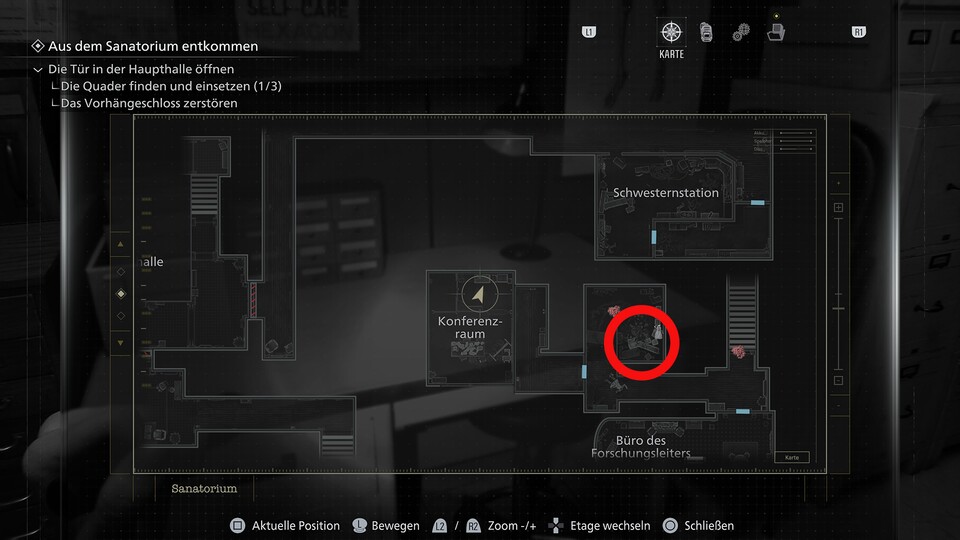 Fundort des Safes: Ebenfalls im Ostflügel des Sanatoriums, im Untersuchungszimmer im Erdgeschoss. Der Tresor steht in der hinteren rechten Ecke des Raums.