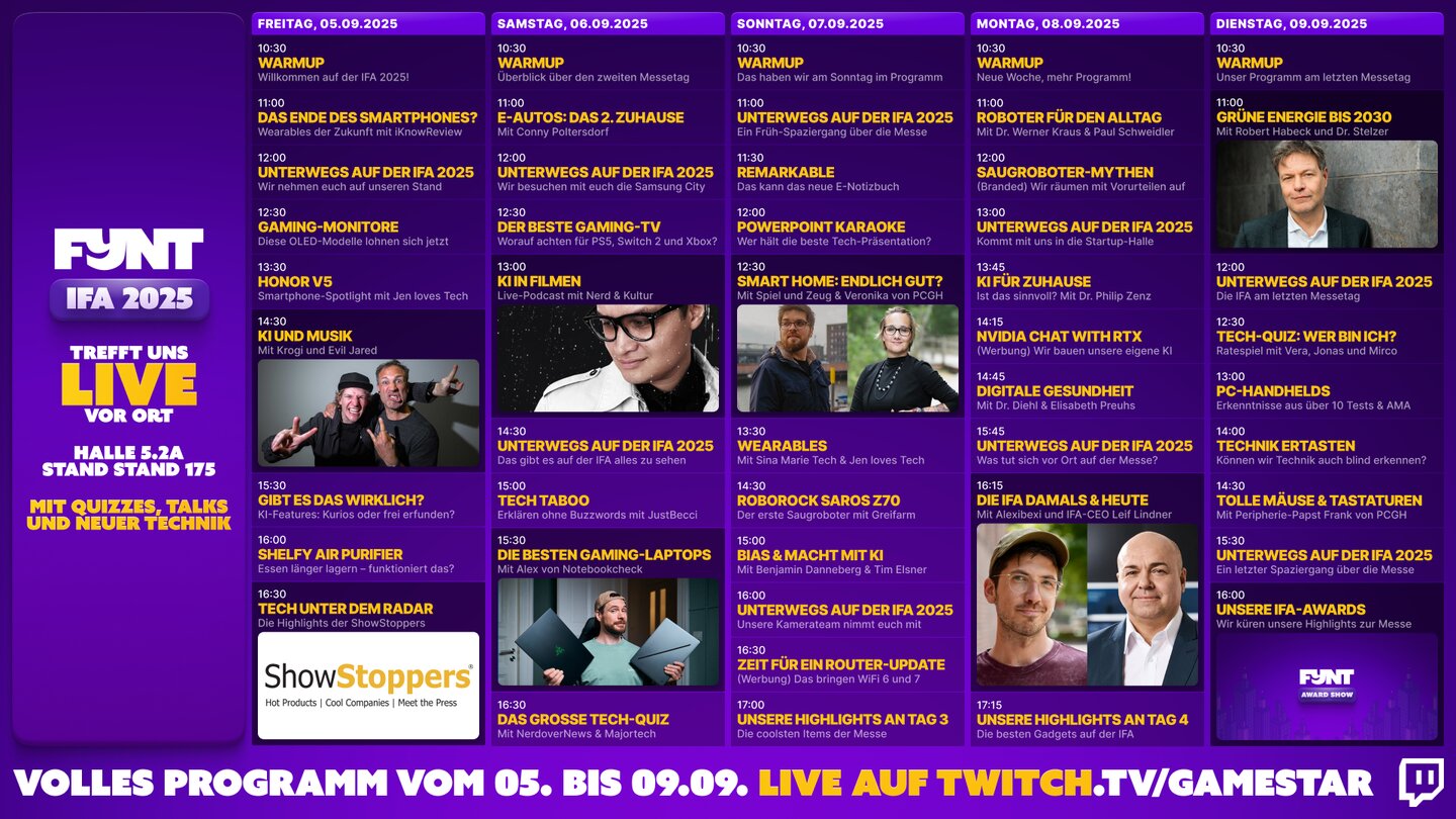 Zur Erinnerung: Unser FYNT-Stream von der IFA 2025 startet am kommenden Freitag, dem 05. September, um 10:30 Uhr auf unserem Twitch-Kanal. Wir senden danach jeden weiteren Messetag bis einschließlich Dienstag, den 09. September, live bis zum Abend von der Messe.