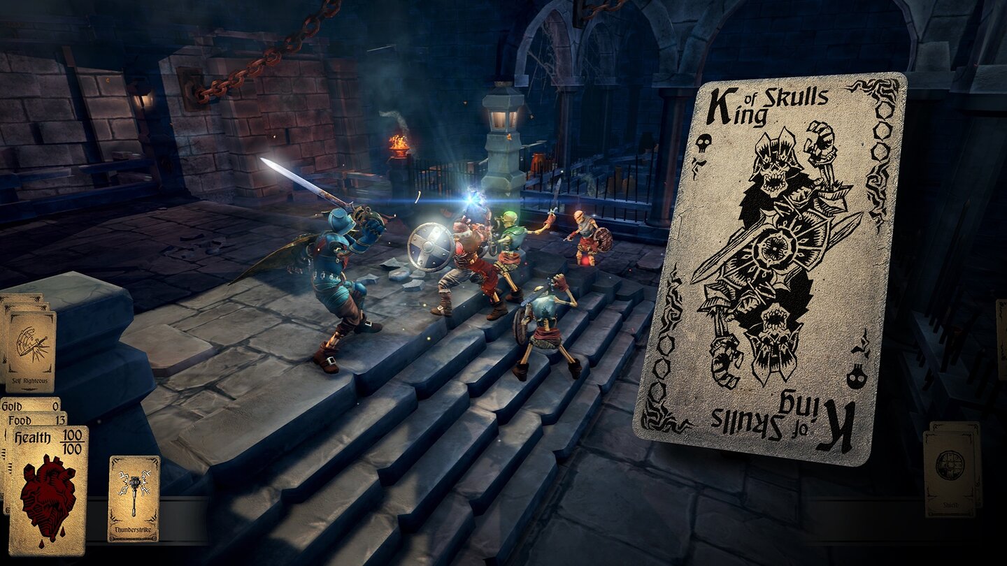 Das Coole dabei: Jede Karte, auf die ich dabei stoße, schalte ich für meine Sammlung frei. Und vor jeder Partie stelle ich mein Deck aus möglichen Gegenden, NPCs und Schätzen zusammen, auf die ich während des Abenteuers treffen kann. Der Dungeon Master erweitert wiederum mit jeder Partie sein Repertoire an Gemeinheiten. Kommt es zum Kampf, wird Hand of Fate quasi zum Mini-Diablo: Ich weiche Fallen aus, verdresche Monster und setze klug meine bis dato gesammelten Spezialfähigkeiten ein. Hand of Fate ist sicher kein Spiel für eine durchzockte Nacht, ein Run dauert selten länger als 30 Minuten, aber dafür umso idealer für kurzen Rollenspiel-Snack zwischendurch. Und der Zufallsfaktor sorgt gepaart mit der Kartensammelei dafür, dass es mir so schnell nicht langweilig werden wird. Hmm, vielleicht sollte ich also doch mal Bier über mein Erdbeereis gießen…