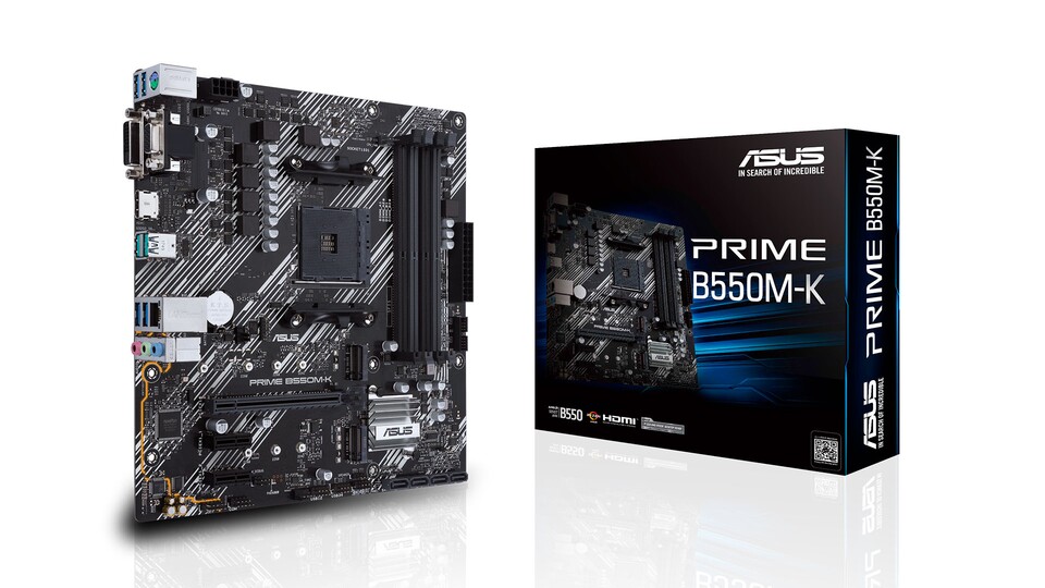 Natürlich darf das passende Mainboard nicht fehlen. Verzichtet ihr auf Schnickschnack, den ich nicht braucht, könnt ihr auch hier eine Menge Geld sparen. Das ASUS Prime B550M-K verfügt über vier RAM Steckplätze, die ihr mit maximal 128GB ausreizen könnt. Außerdem sind zwei NVMe Steckplätze an Bord, die euch schnelle SSDs nutzen lassen, die eure Ladezeiten senken. Das micro ATX-Format des Mainboards lässt sich auch problemlos in einem größeren ATX-Gehäuse montieren.