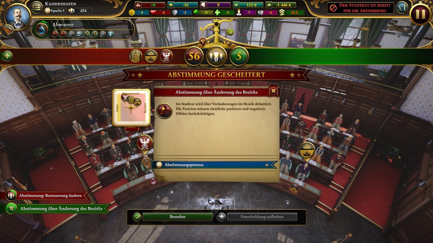 Haben wir starke linke Parteien, können wir die Eliten ordentlich besteuern, mit starken Rechts-Konservativen bringen wir eher Maßnahmen gegen die Unterschicht durch. Das schafft theoretisch die gewünschte Spieltiefe, praktisch leidet das Konzept aber daran, dass uns das Spiel zu wenig Informationen zur Verfügung stellt. Wie wählen die Bürger ihre Parteien und warum? Wir bekommen nur durch Zeitungsmeldungen die Ergebnisse einer Wahl um die Ohren gehauen, wie es dazu kam, erfahren wir nicht.
