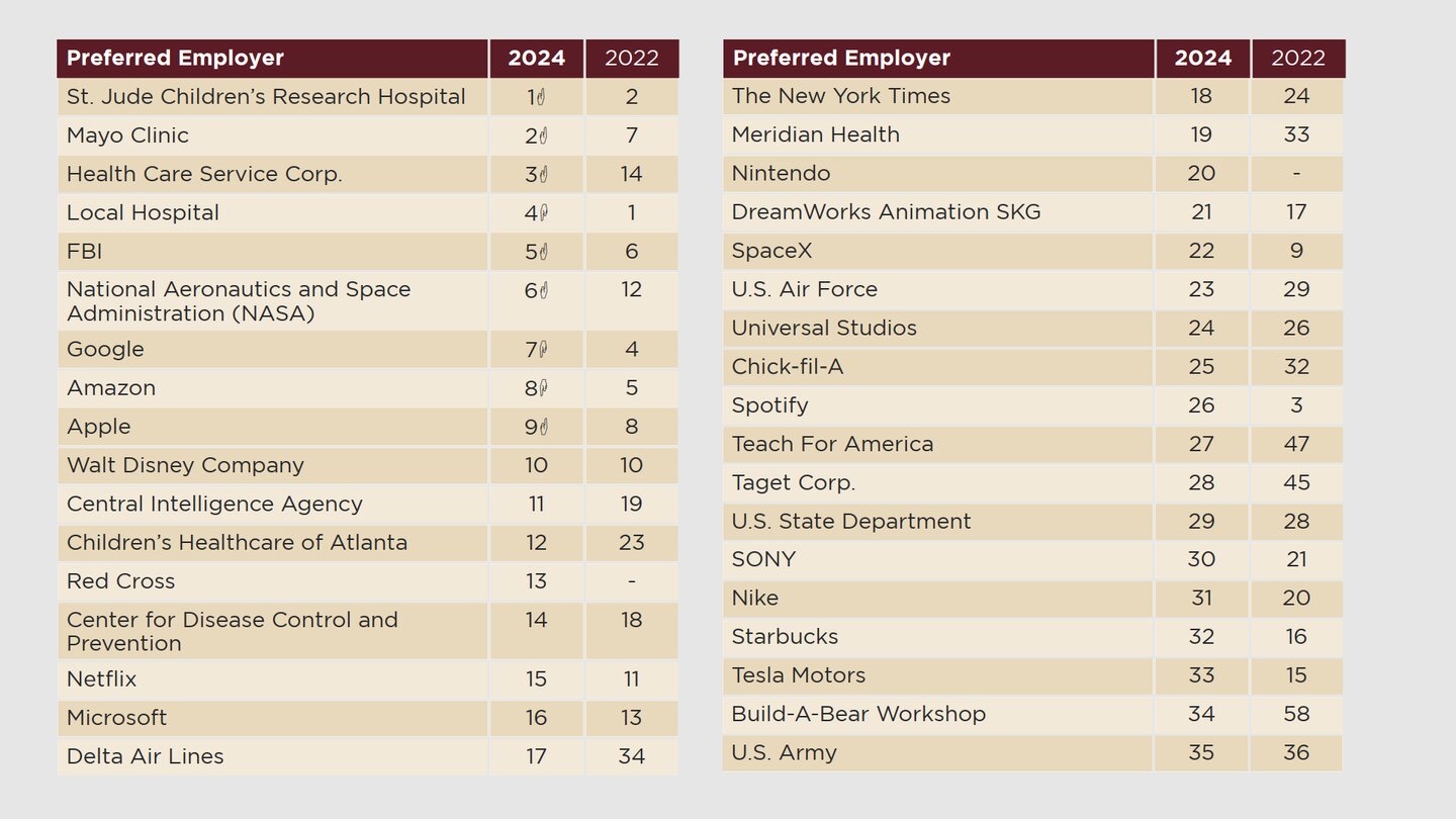 Die Studie der NSHSS wollte 2024 zudem genau wie bereits 2022 wissen, welche konkreten Arbeitgeber die jungen Menschen besonders interessant finden.