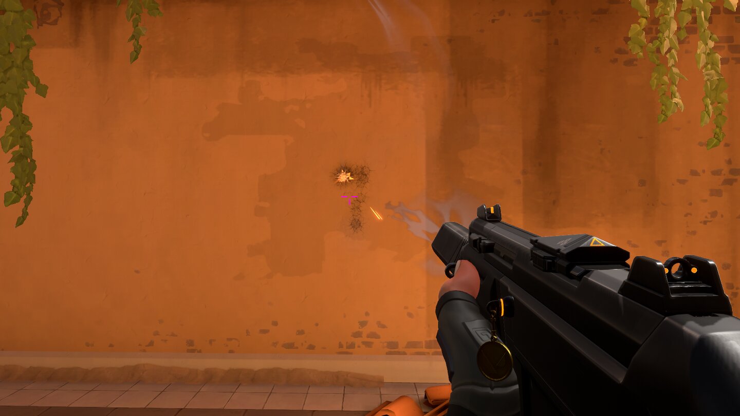 Ohne Visier: Das Fadenkreuz bewegt sich beim Dauerfeuer kaum, während die Einschlagstellen der Kugeln langsam nach oben wandern. Dieses System ist so ebenfalls in Counter-Strike vertreten. Es eignet sich in Valorant sowohl für den Nahbereich als auch weiter entfernte Ziele, da es keine Mali für's Visier-freie Schießen gibt. Bei den meisten Waffen bringt diese Art des Schießens zudem eine höhere Schussfolge.