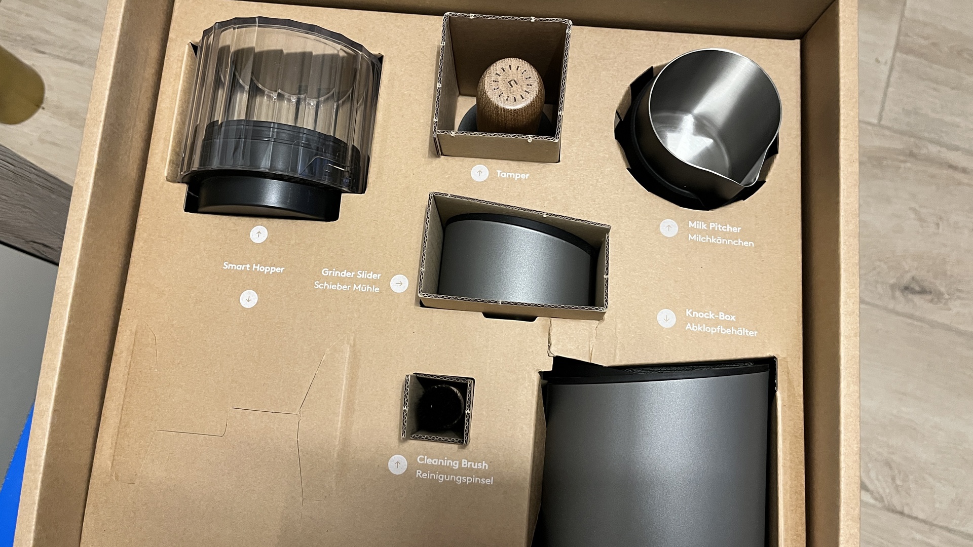 Ich hatte zuvor keine Erfahrung mit Siebträgermaschinen und hatte bei der Lieferung Respekt: Siebträger, Hopper, Tamper, Milchkännchen, Wasserfilter – ein kleines Arsenal, das erst mal einschüchternd wirkt.