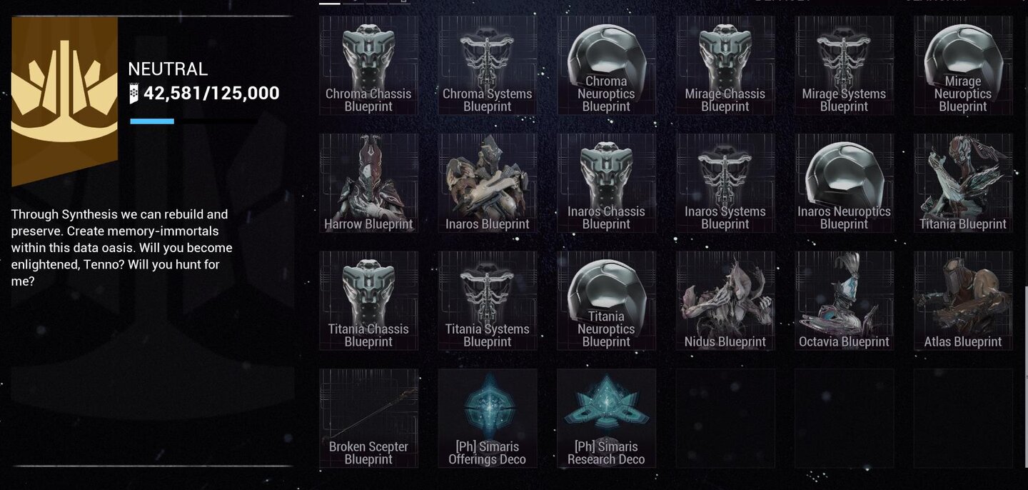 So funktioniert das kommende Buyback-System: Im Laden von Cephalon Simaris in den Relays des Warframe-Universums, könnt ihr in Zukunft einzigartige Questgegenstände wie Waffen- und Warframe-Blueprints für Standing kaufen.