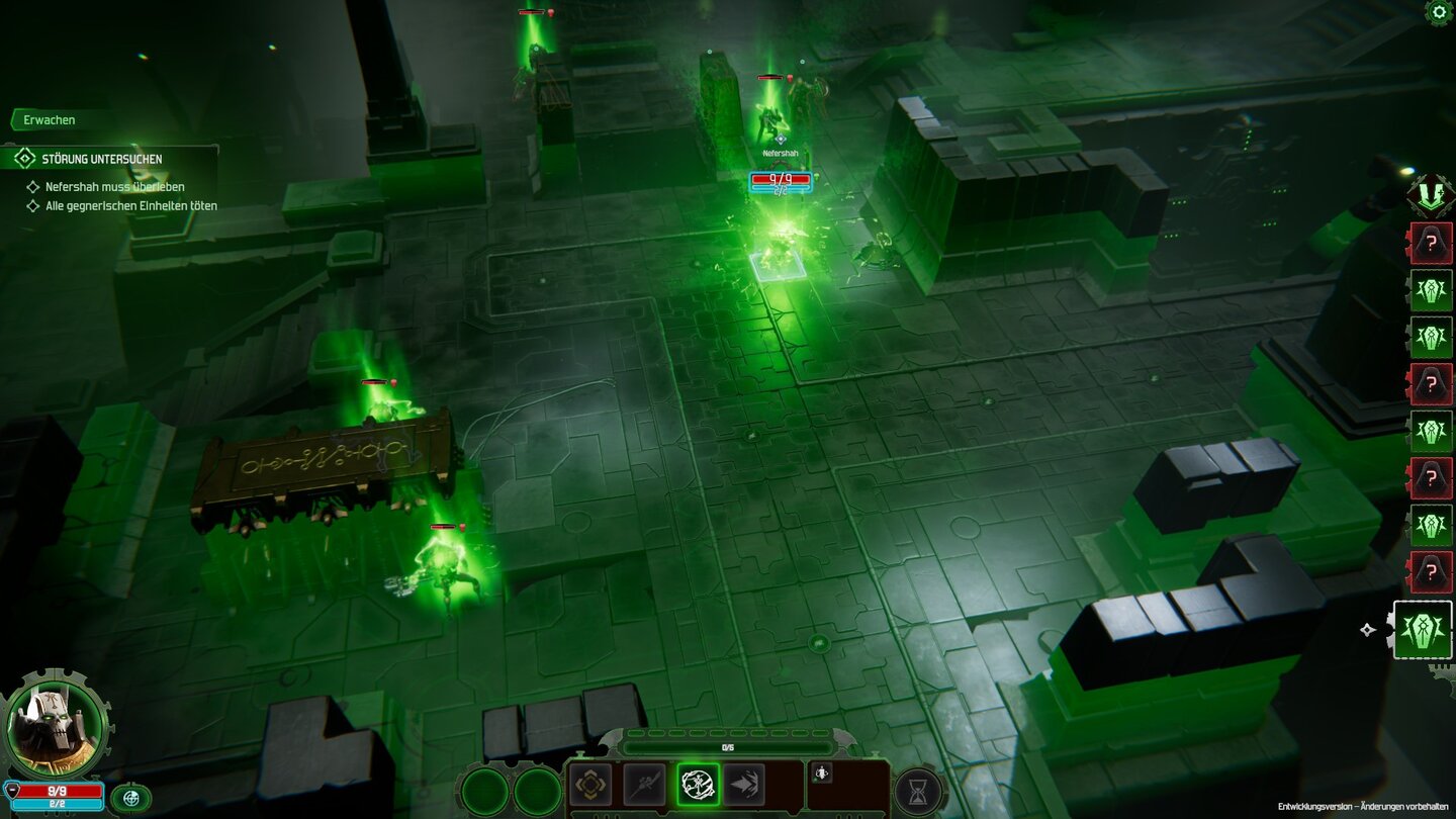 Warum sind Untote so cool? Na, weil sie untot sind! Duh! Die wohl größte Stärker der Necrons in Mechanicus 2 ist wohl das Reanimationsprotokoll. Stirbt eine Einheit zum ersten Mal während des Kampfes, wird sie nach drei vollen Runden wiederbelebt. Liegt eine Einheit bereits mit einem Wiederbelebungs-Countdown am Boden, können die Techpriester erneut auf sie schießen, um so die Wiederauferstehung zu verhindern.