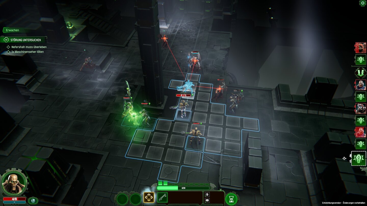 Wir konnten bereits in das Tutorial-Intro von Mechanicus 2 reinschnuppern, das etwa eine Stunde lang geht. Darin erklärt das Spiel seine ersten Story-Fetzen und stellt die zwei spielbaren Fraktionen vor. Im Intro schlüpfen wir in den Kämpfen abwechselnd in die Rolle der Techpriester und der neuen Necrons. Danach werden wir im fertigen Spiel aussuchen können, wessen Kampagne wir zuerst spielen möchten.