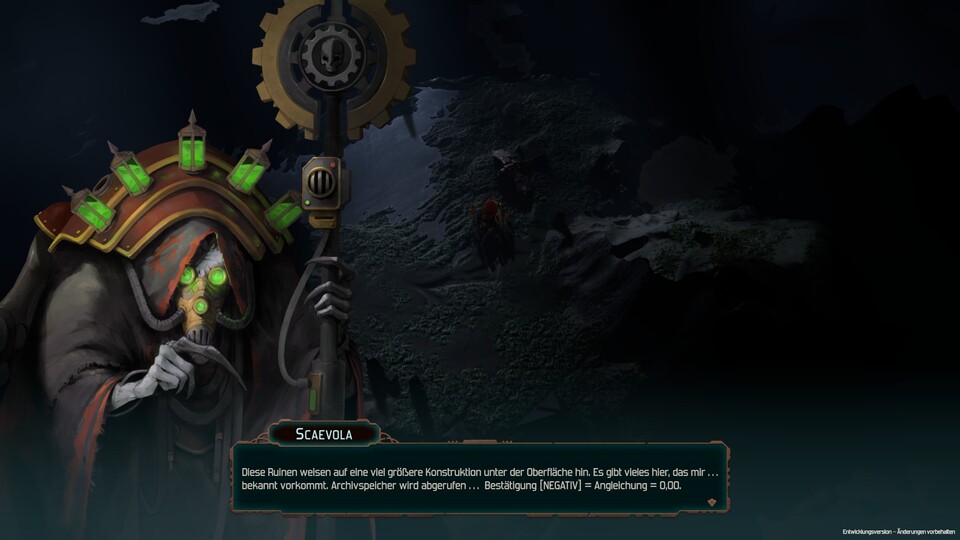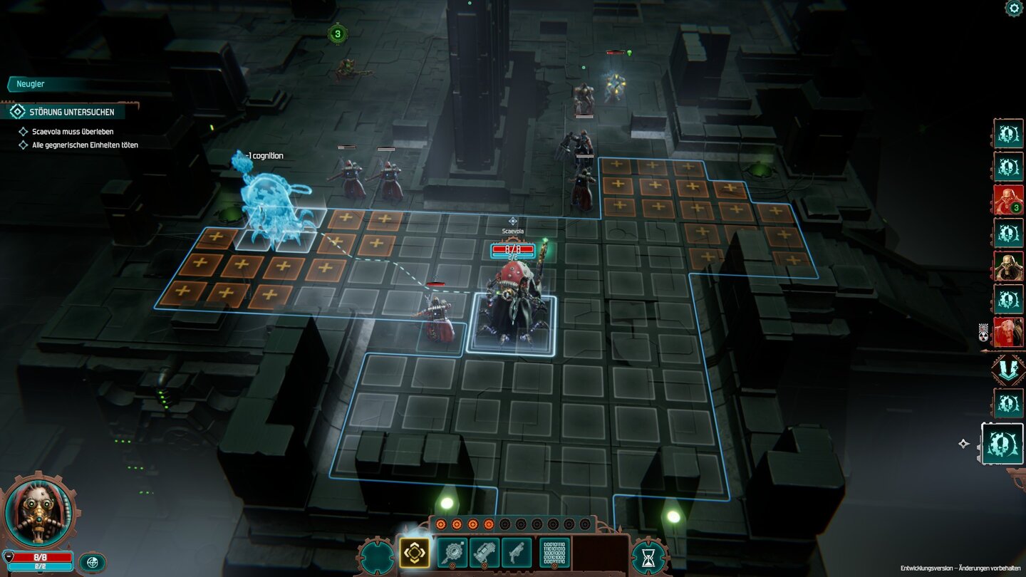 Das Tutorial macht uns zunächst mit den Techpriestern vertraut, die wir schon aus dem ersten Teil kennen. Oberste Priorität in den Kämpfen: Anführer Scaevola muss überleben. Wir platzieren also unsere Einheiten, kämpfen mit Nah- und Fernwaffen, setzen Fähigkeiten ein und sammeln sogenannte Kognitionspunkte, um unseren Einheiten mit Lobliedern einen kleinen Boost zu verpassen.