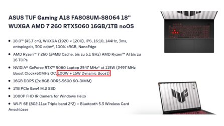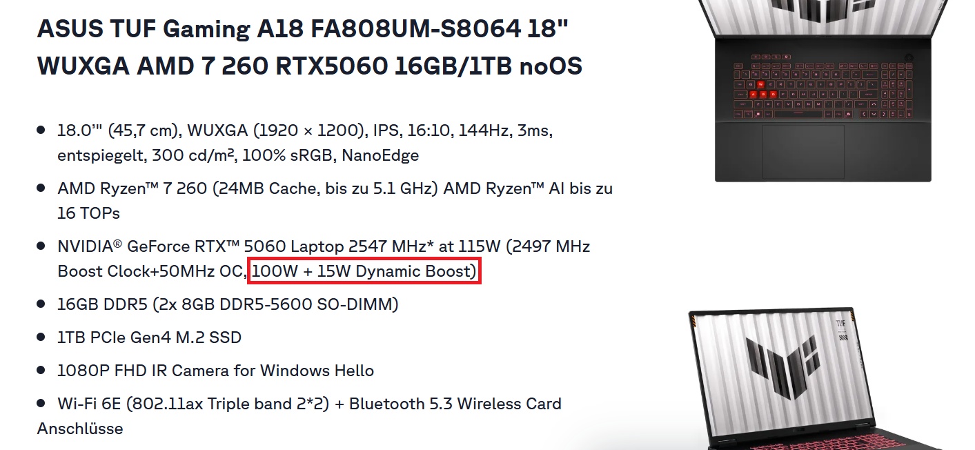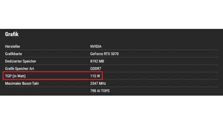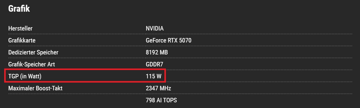 Wenn ein Shop die TGP nicht angibt, bleibt nur der Weg auf die Webseite des Herstellers. Hier solltet ihr dann gewöhnlich fündig werden. Während Hersteller wie beispielsweise Asus, XMG und Asus dann auch kein Geheimnis daraus machen, mit welcher TGP die GPU betrieben wird, sieht das bei anderen Unternehmen leider etwas anders aus.